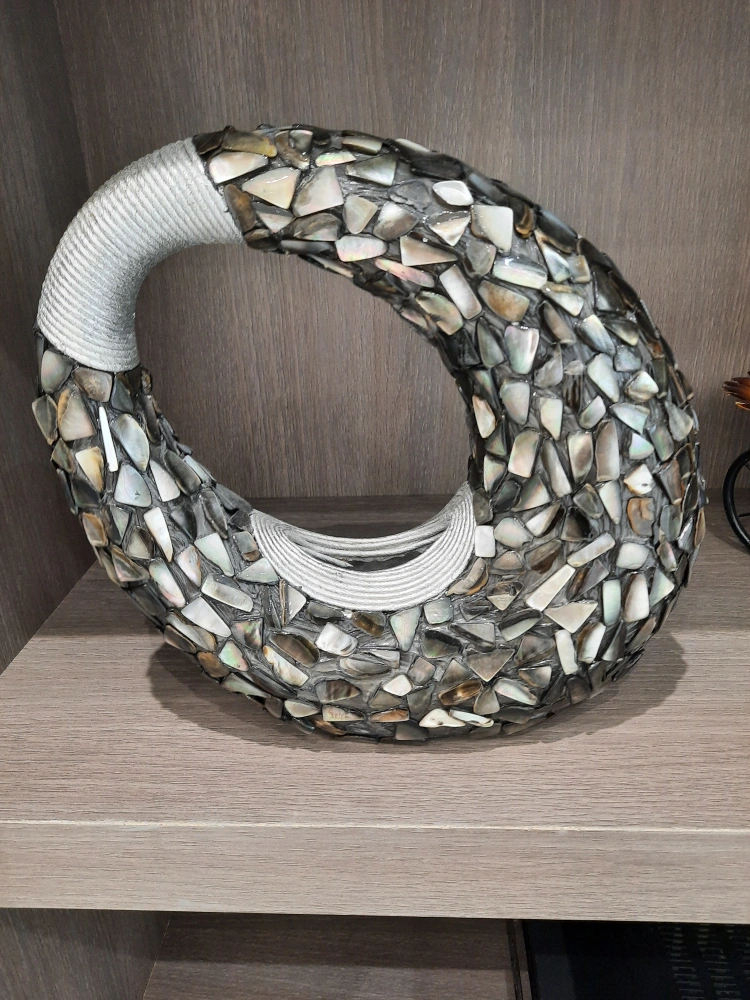 10Unique decorative vase featuring shell detailing and rope accents. It's in great shape and ready to add a touch of coastal charm to your home!