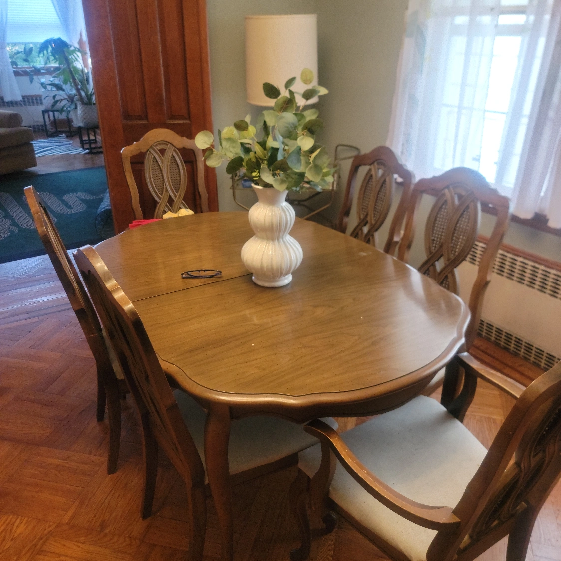 Selling a dining table with six chairs. Classic design with woven detailing on the chair backs, newly reupholstered cushions. Very good condition.