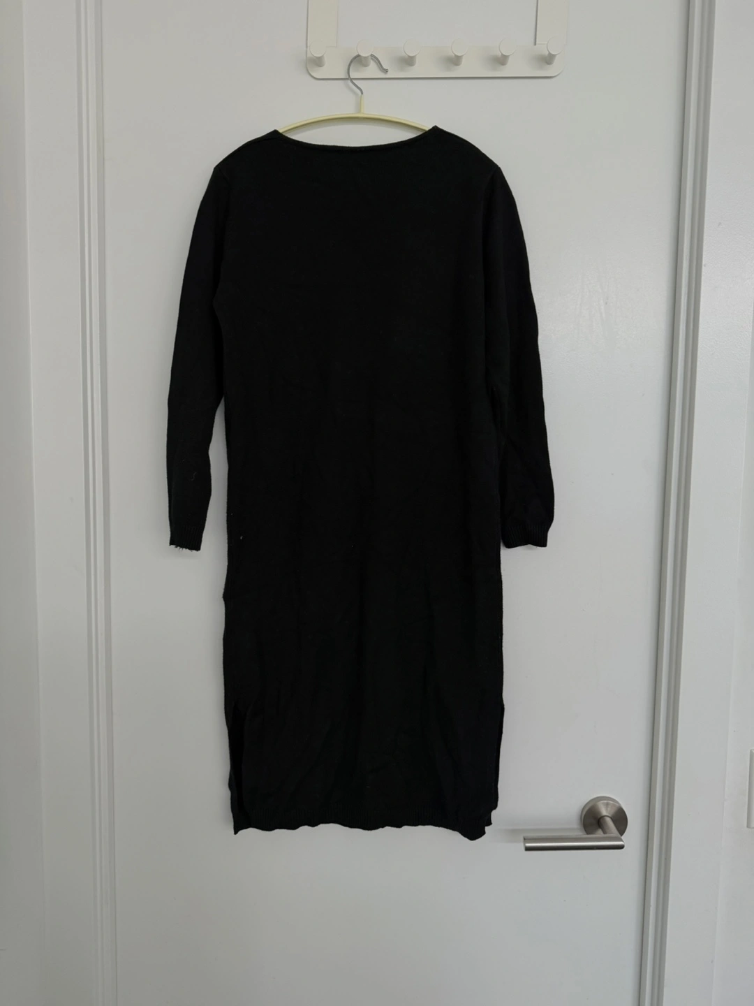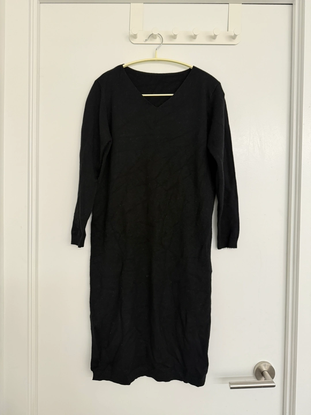 A simple and comfy black knit dress, perfect for layering or wearing on its own. It's a size small and in great condition! The material is soft and cozy, making it ideal for everyday wear. Would fit someone around 5’4’’ Pick up only - downtown Toronto Cash only