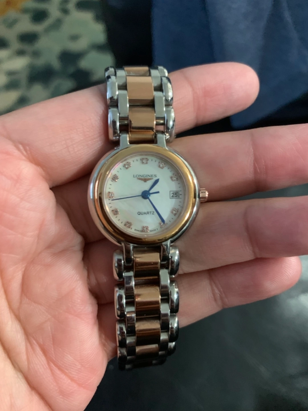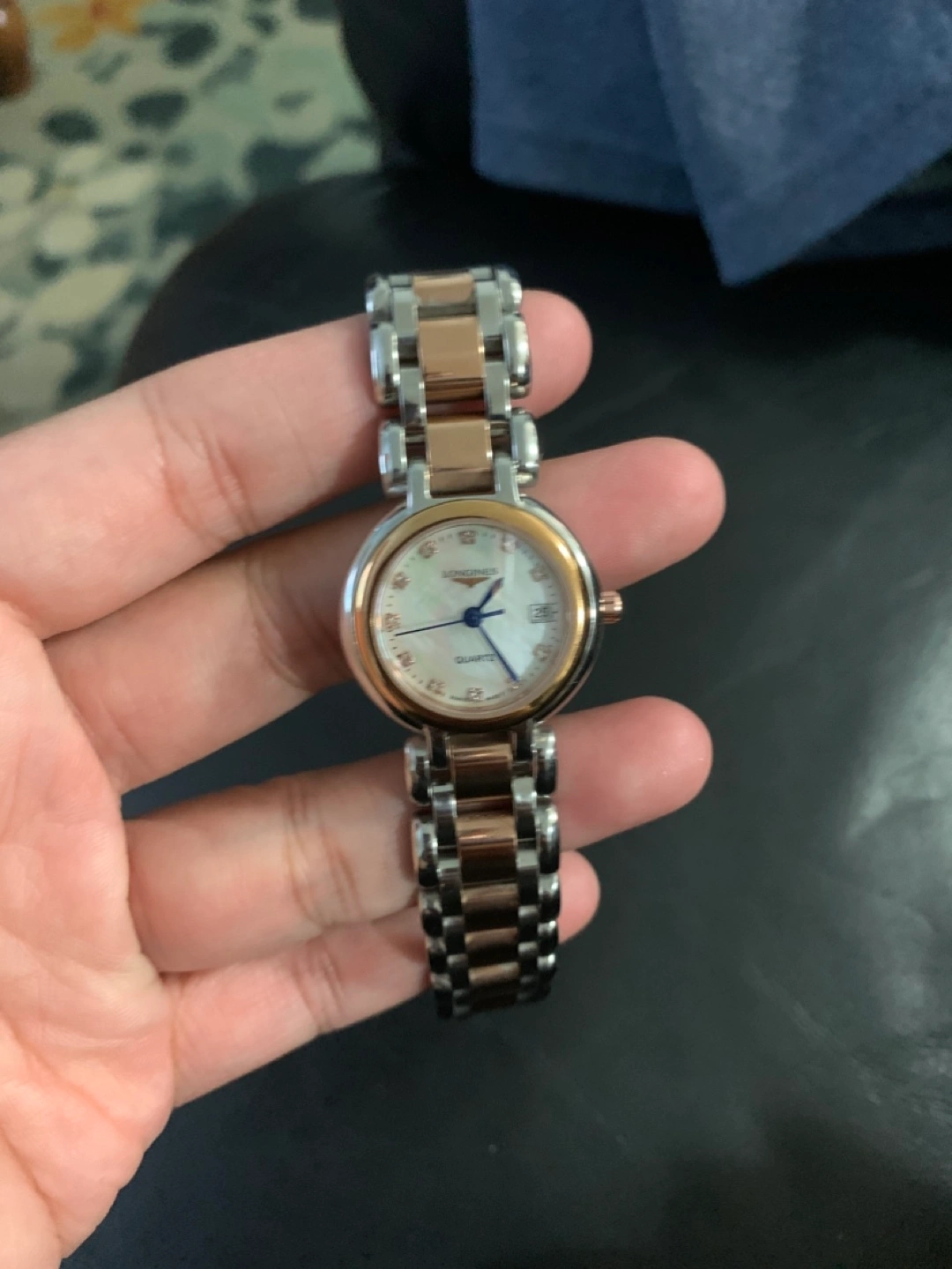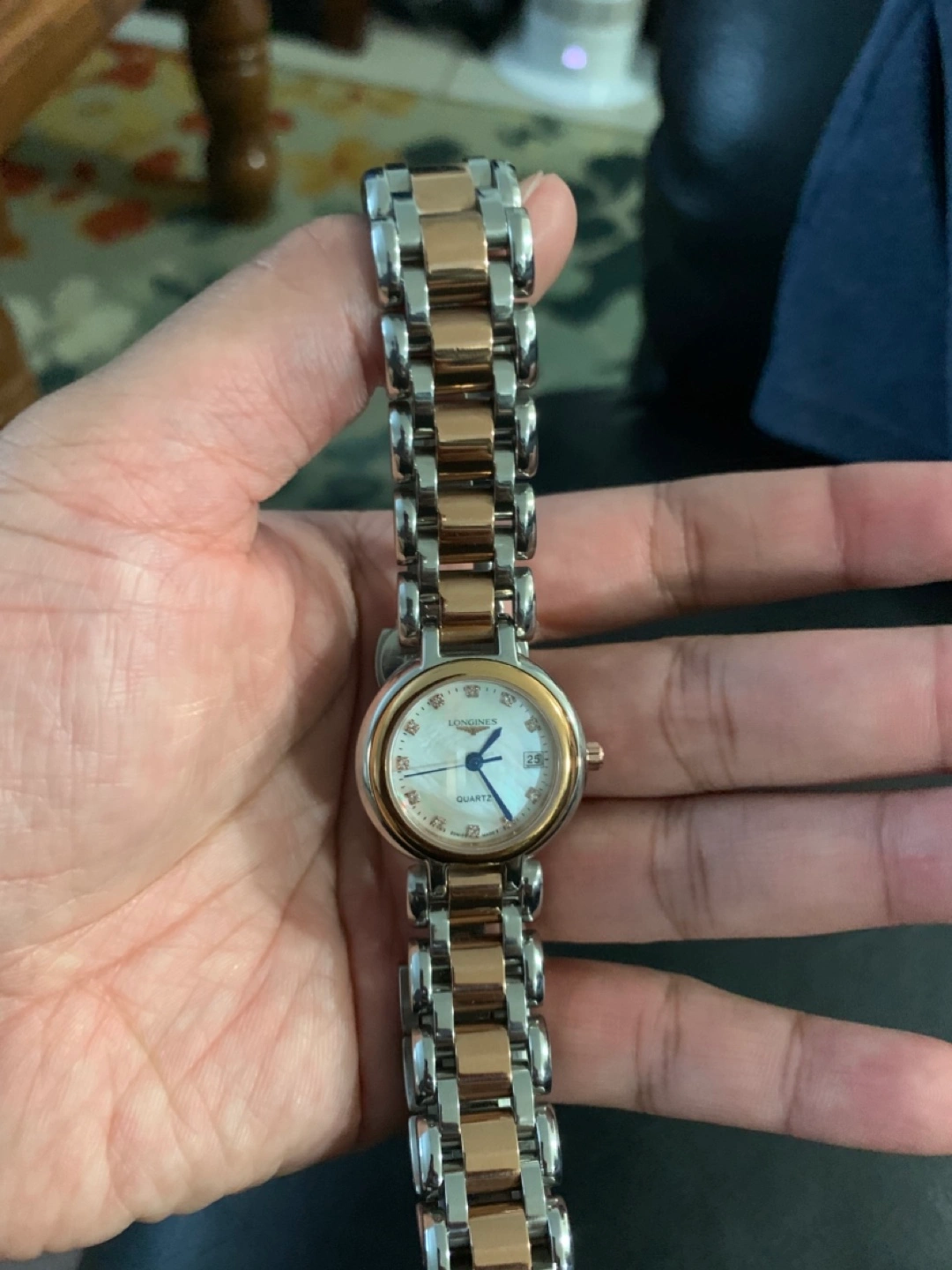 Selling a lovely Longines ladies 18k rose gold and stainless steel watch.Diamond hour markers and blue -sword shaped hands.It's in great shape and ready for a new owner!Newly replaced battery.