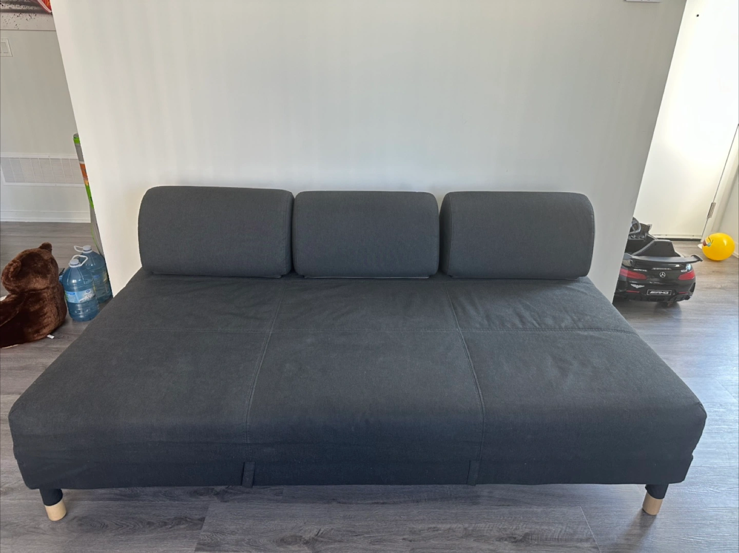 Selling a dark grey sofa bed. It's in great condition and would be perfect for a living room or guest room. The sofa bed is comfortable and easy to convert. It has a modern look that will fit in any home