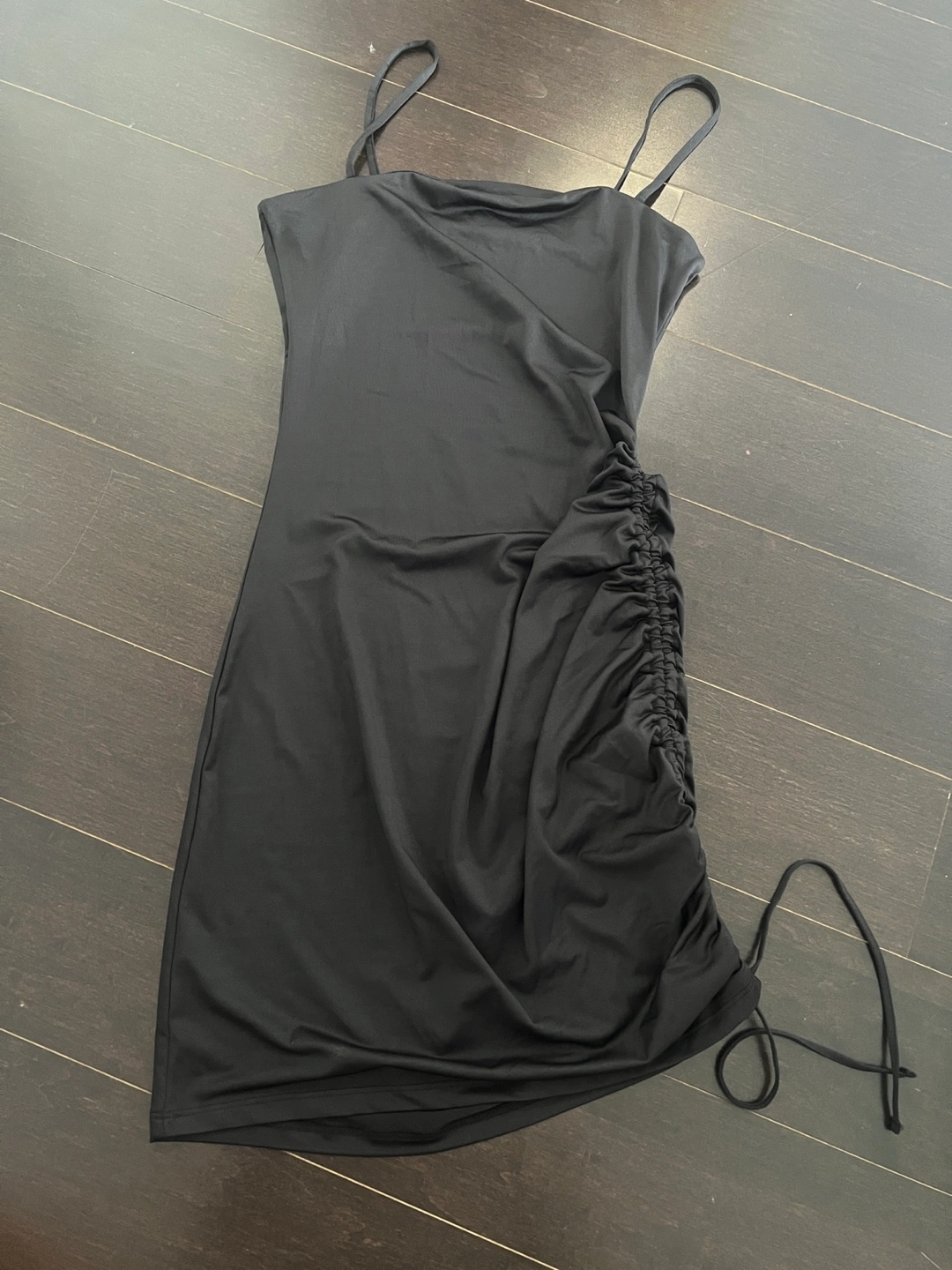 Selling a cute H&M Divided black dress in size small! It's in great condition and features a stylish ruched detail on the side. Perfect for a night out or a casual event.