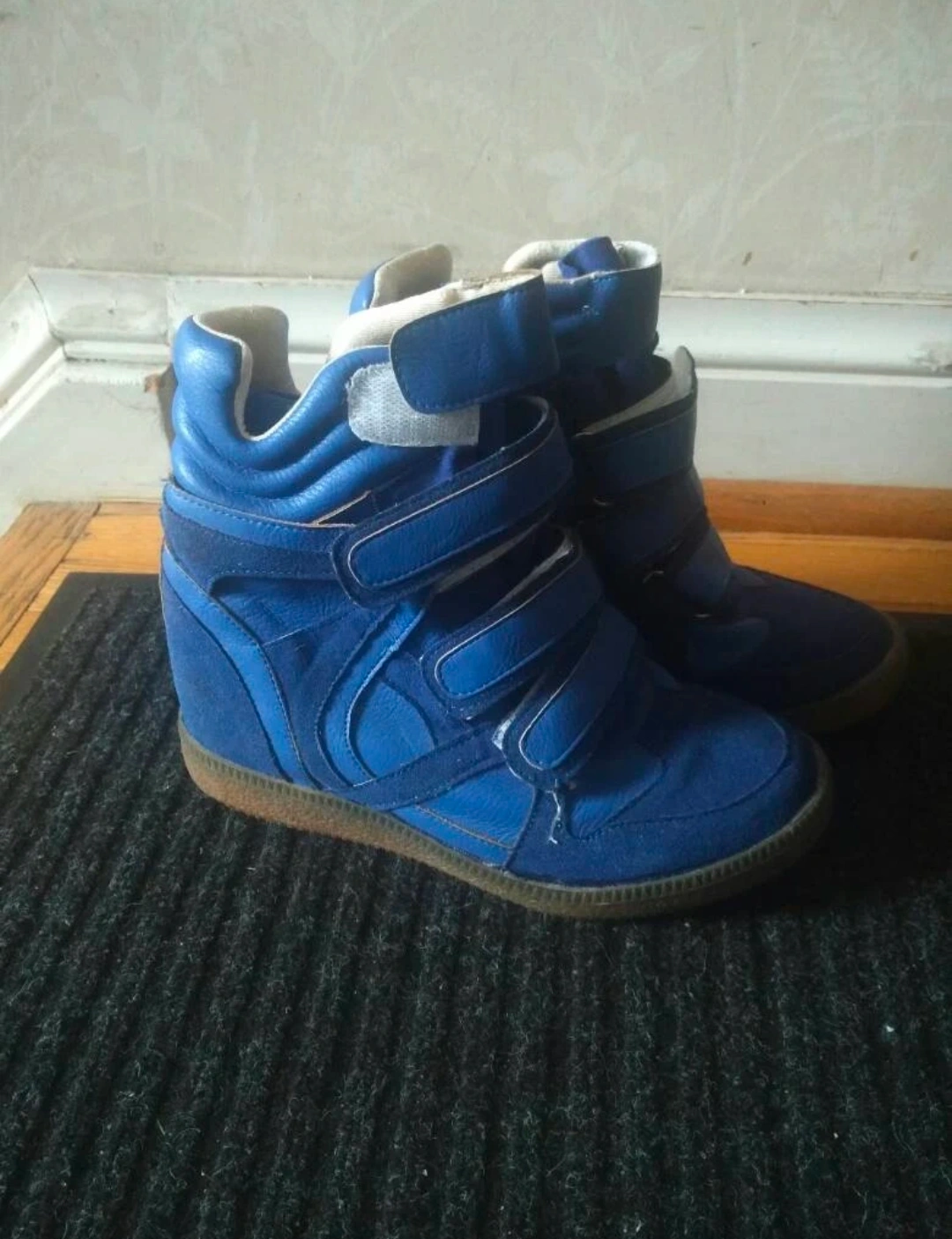 Blue women's sneakers with hidden platform for added height. :) Velcro for easy wear. They are in good condition and have a unique style. Perfect for adding a bit of height and flair to your outfit!
