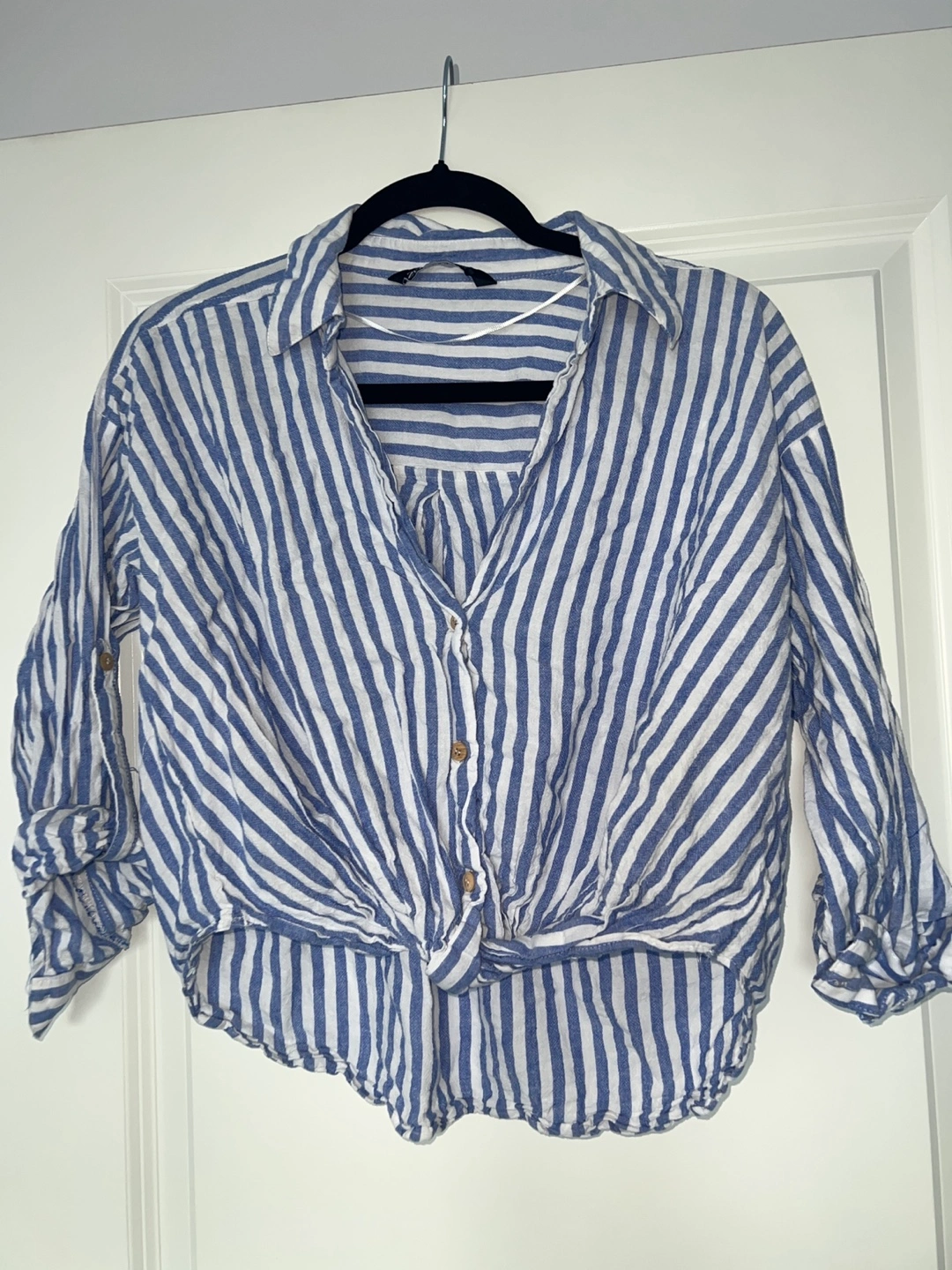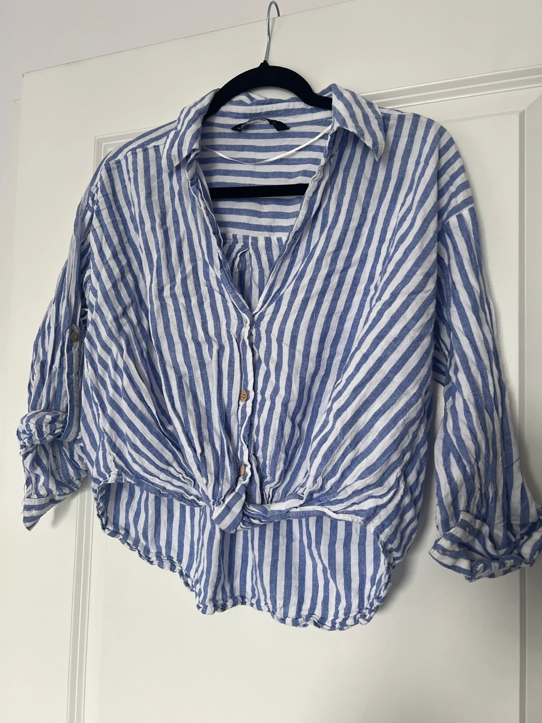 Selling a cute Zara blouse! It's a striped pattern in blue and white. The size is XS and it's in great condition. Perfect for a casual summer look!