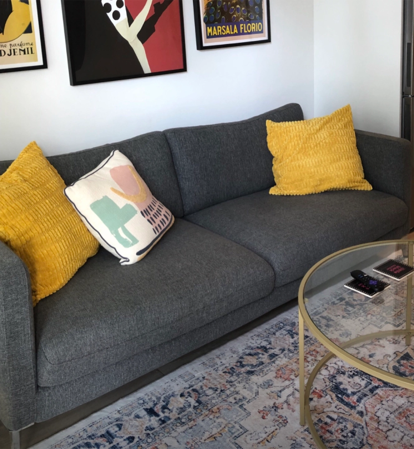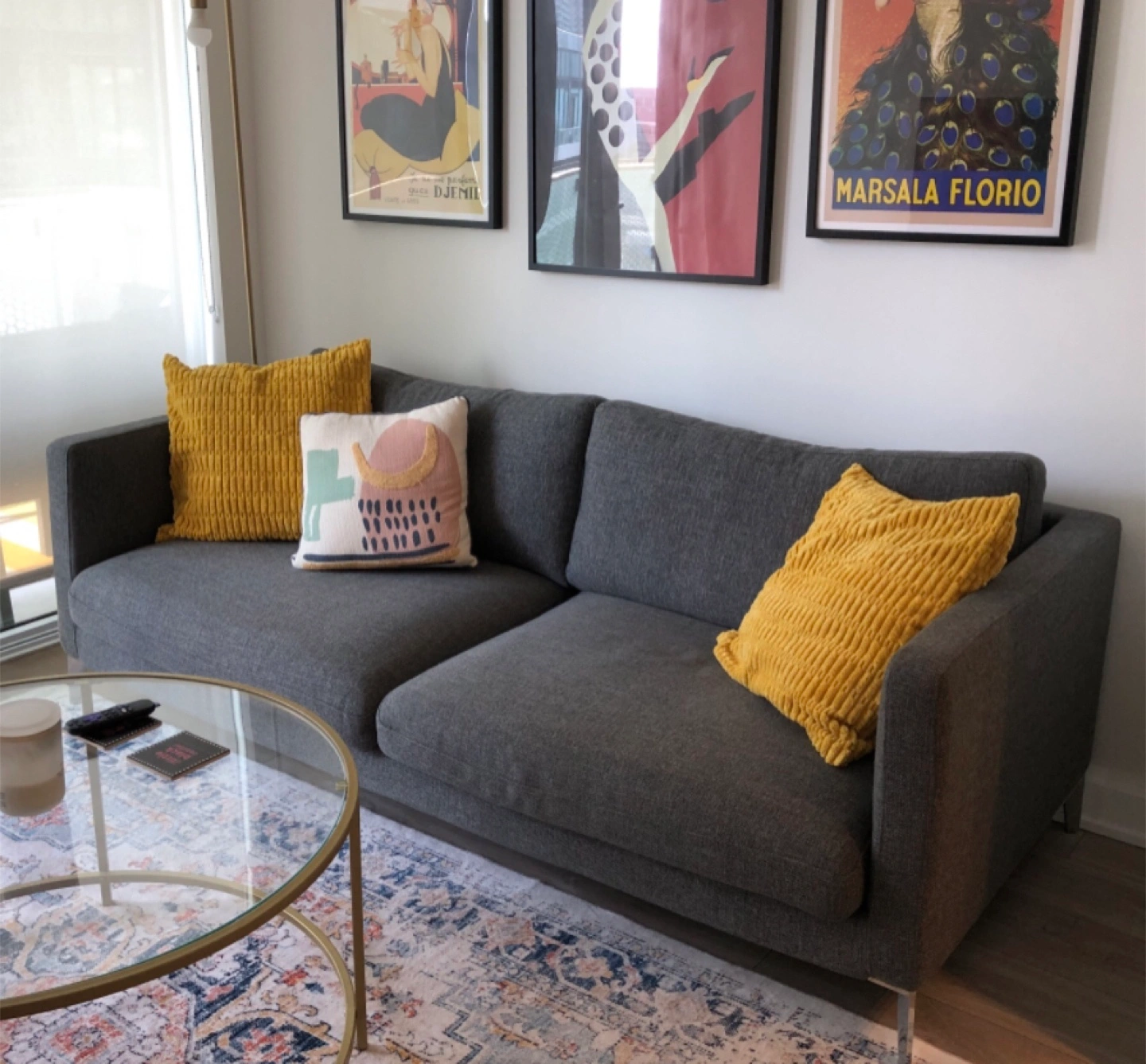 Selling a comfy grey sofa! It's in great condition and would look great in any living room. It has a modern design and is perfect for lounging or entertaining guests. It's a great size for smaller spaces too! Clean smoke free pet free home.