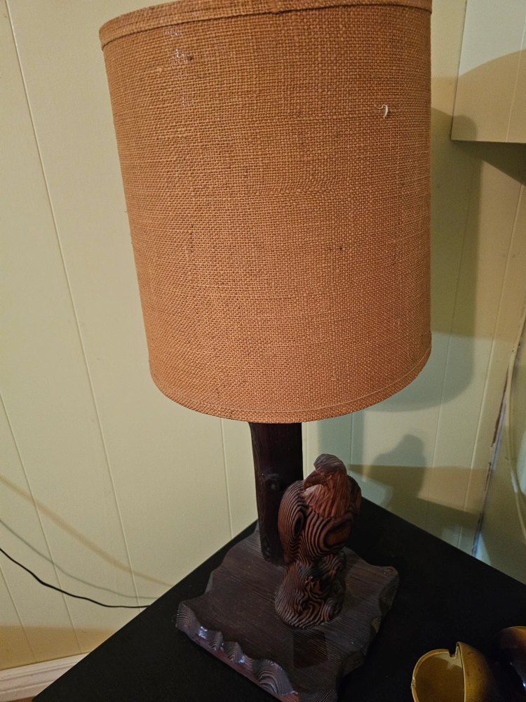 Selling a unique vintage lamp featuring a carved wooden bear & Eagle design. The lamp has a burlap shade and a dark wood base with intricate carvings. It adds a rustic and charming touch to any room. Both for $25