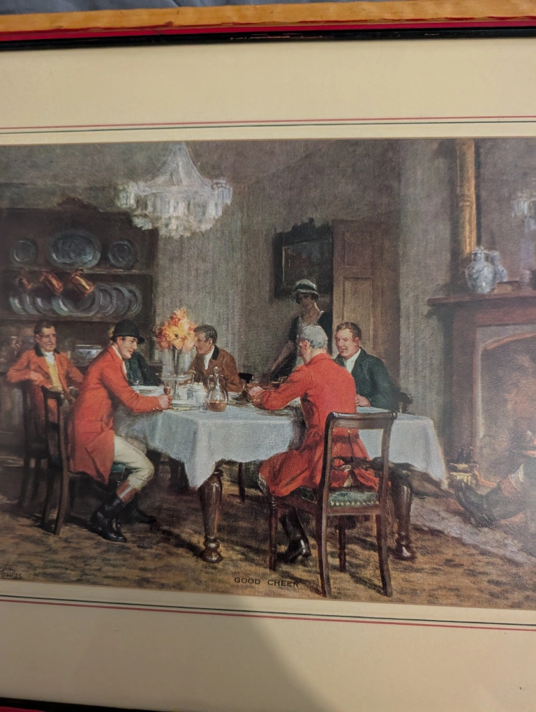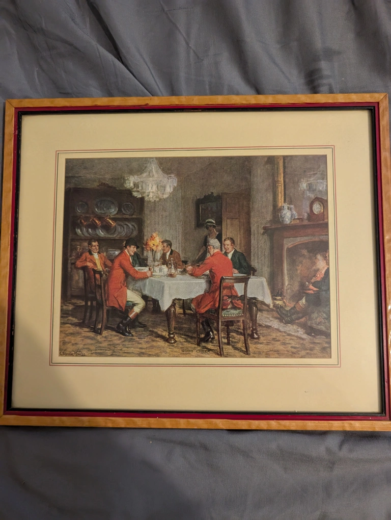 Selling a lovely framed print by Matthews Bros. LTD. The print is titled "Good Cheer" and depicts a scene of people dining. It's a charming piece that would add a touch of classic elegance to any room!