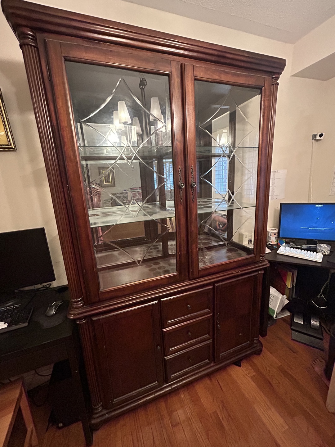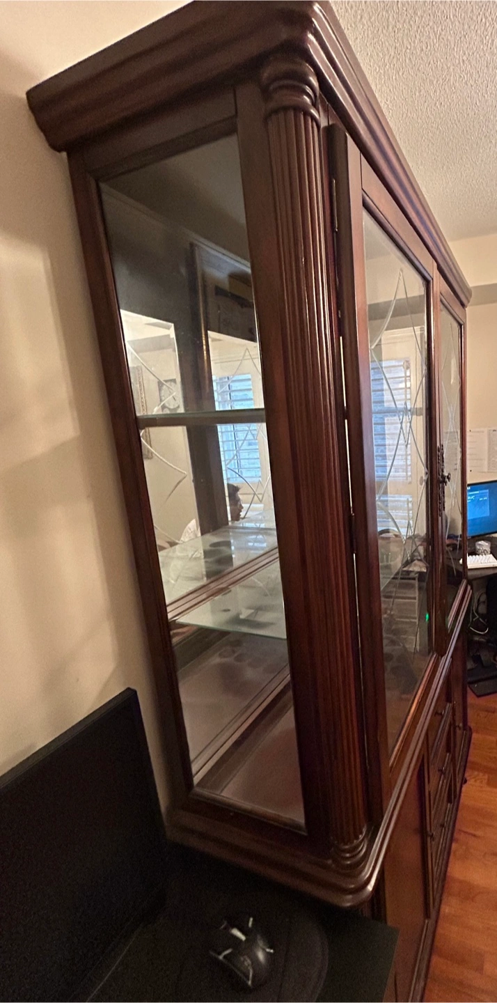 Selling a wooden china cabinet. It has glass shelving and doors with showcasing lights. One side glass is loose and wood has some scratches
