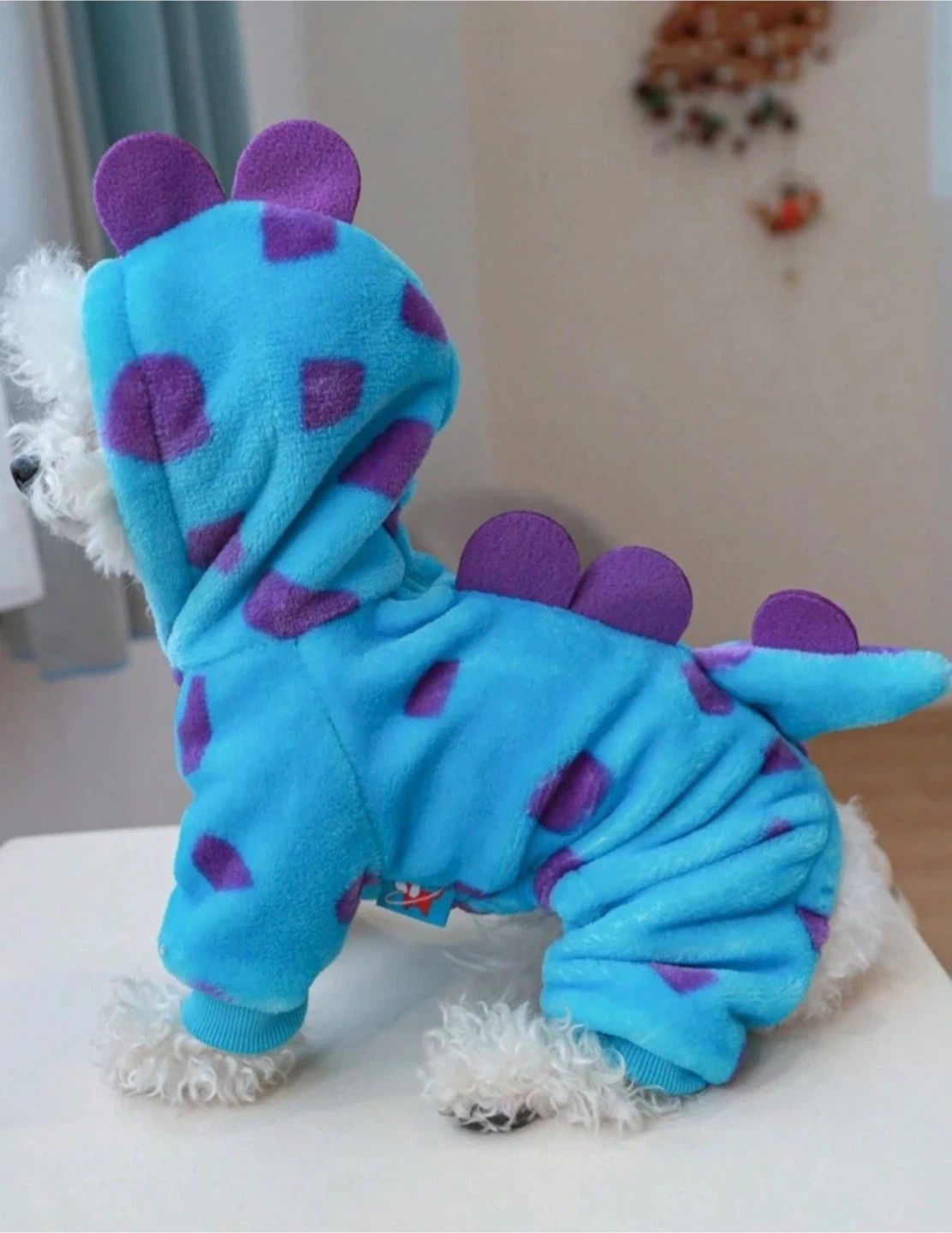 Fleece dog jammies designed to look like Sully from Monsters, Inc. It's a blue onesie with purple spots and includes a hood with ears. This costume is cozy and fun for your pet! Best suited for puppies, kittens or toy sized pals.