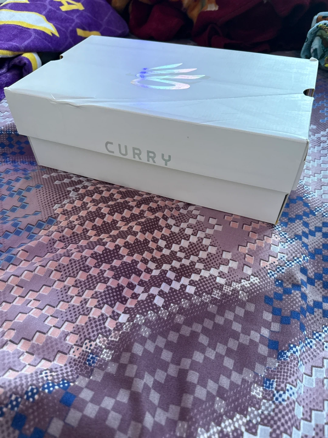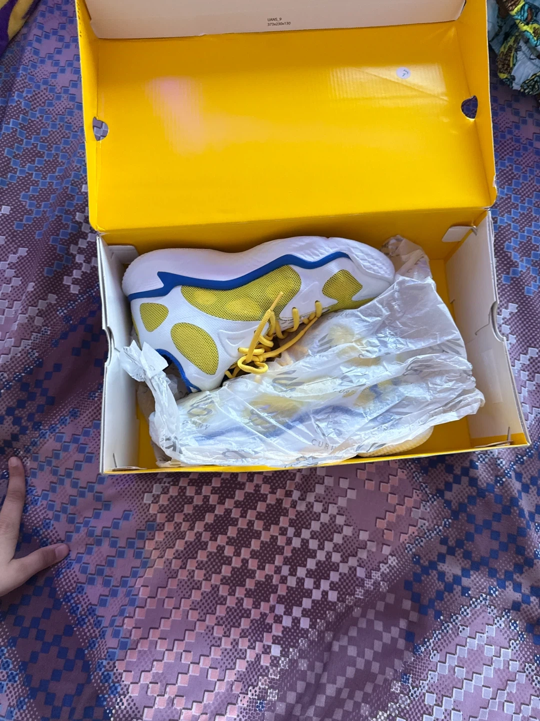These are Curry brand athletic shoes. They're white with yellow and blue accents. Comes in original box.