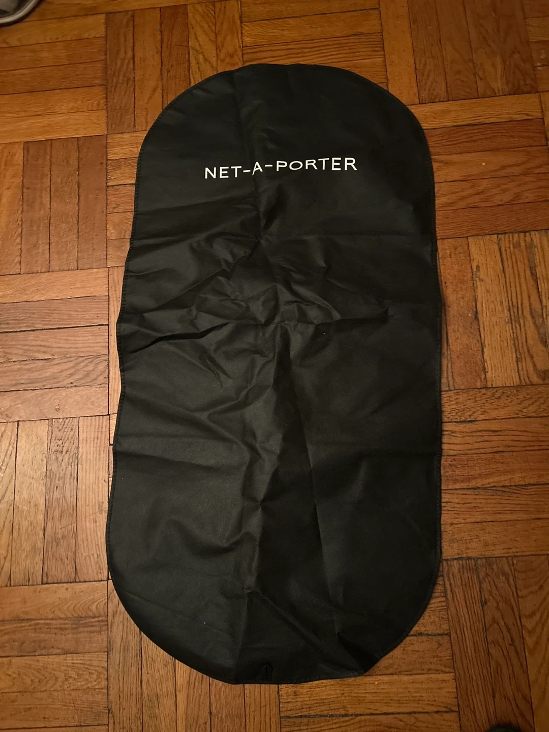 This is a black cloth garment bag from NET-A-PORTER. Perfect for storing or transporting clothing. Free! Pick up on the upper west side of Manhattan.
