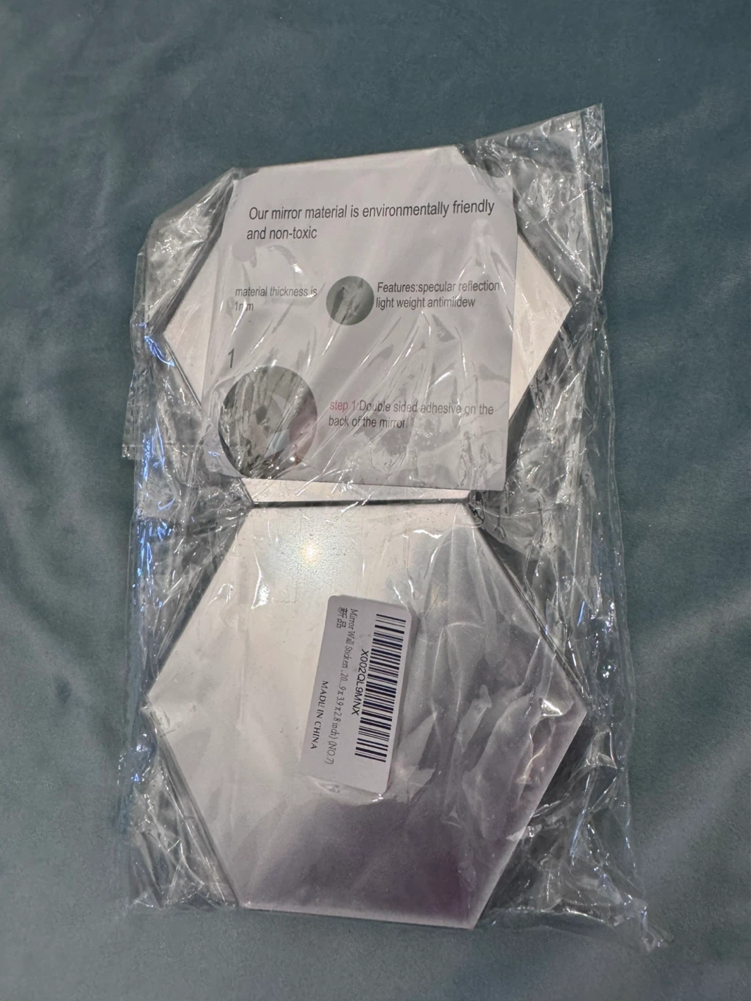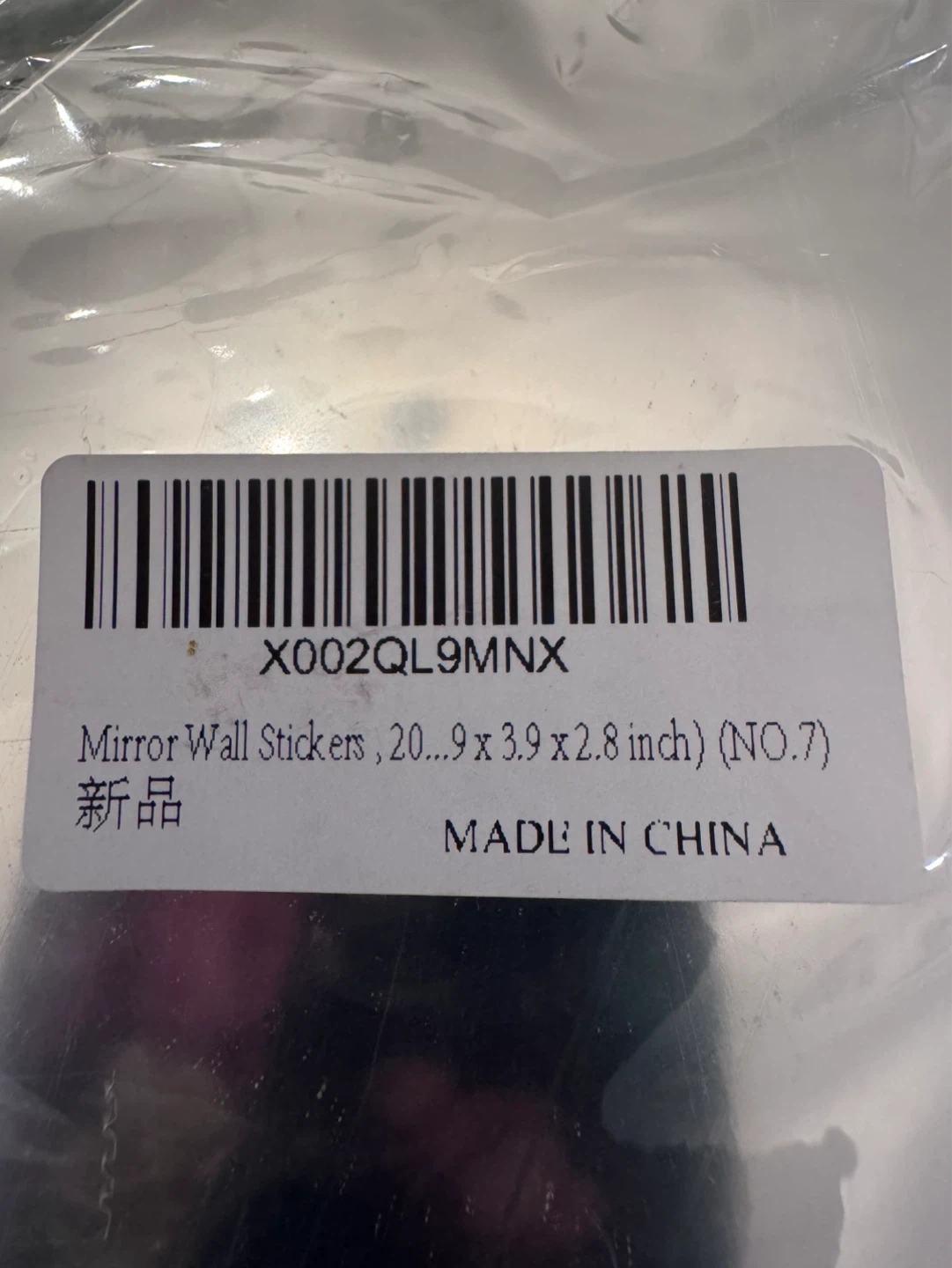 Environmentally friendly and non-toxic mirror material. Features specular reflection, light weight, thin material thickness 1mm. Comes with double-sided adhesive on the back. Hard to tell but I think there are 24 hexagons- package sealed. Dimensions in photo of each