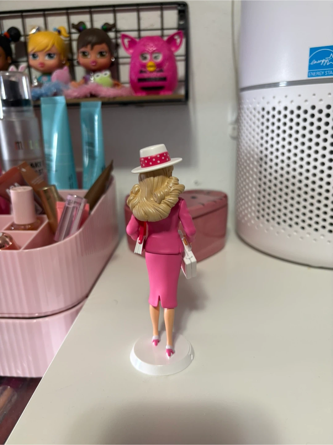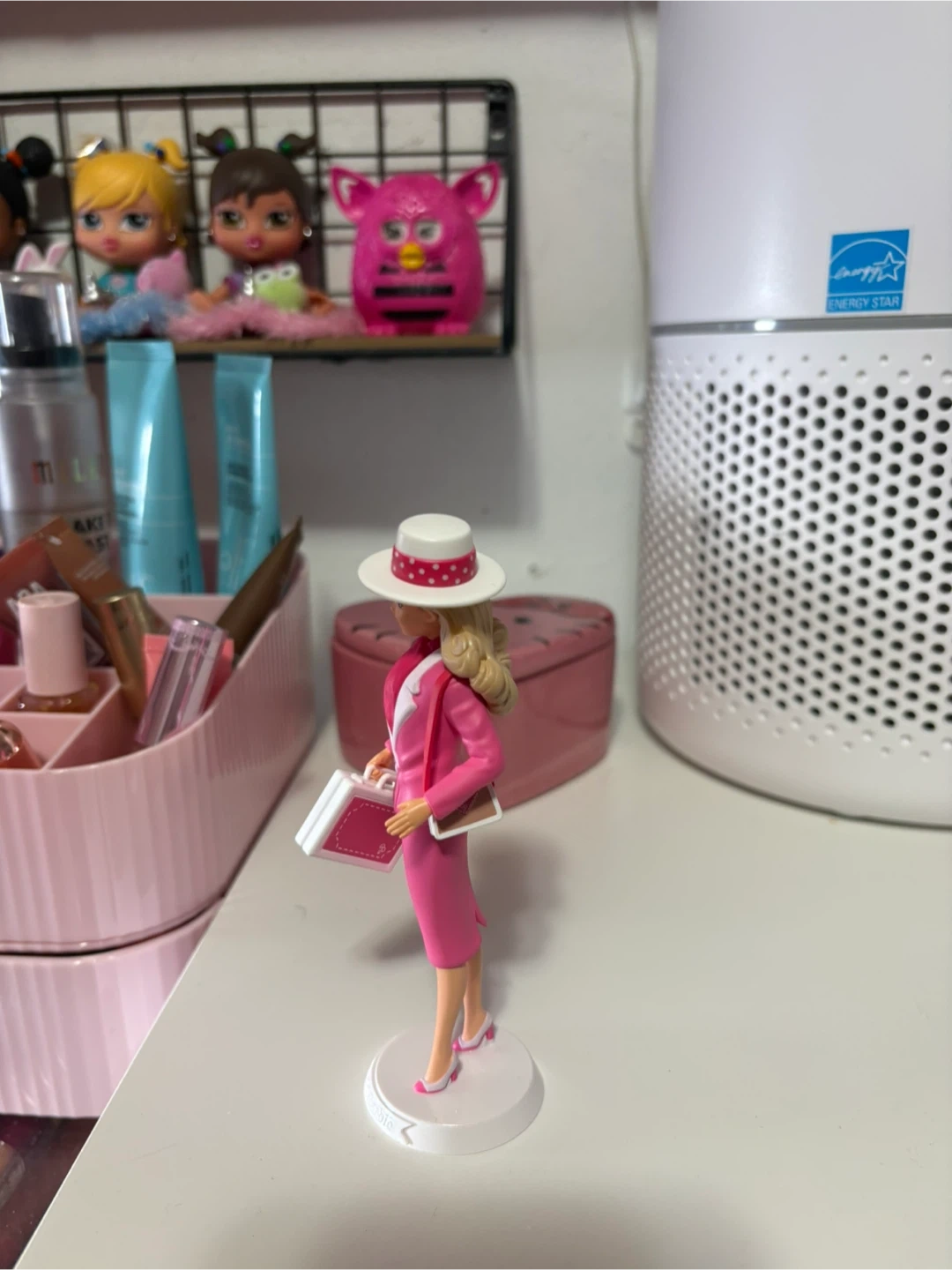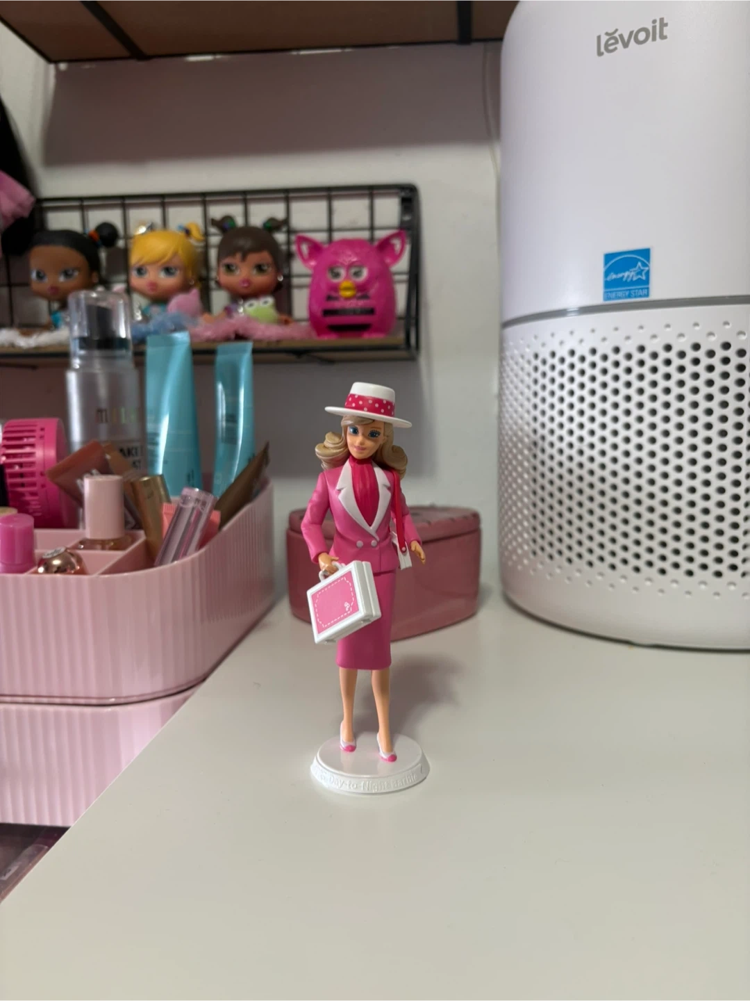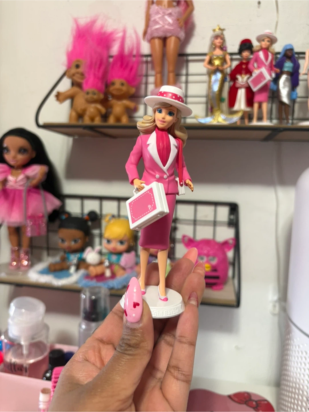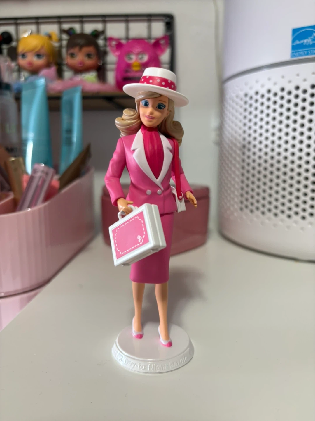 This is a Barbie doll dressed in a stylish pink business suit with a matching hat and briefcase. It's a classic collector's item or a fun toy for playtime. The doll stands on a white display base.