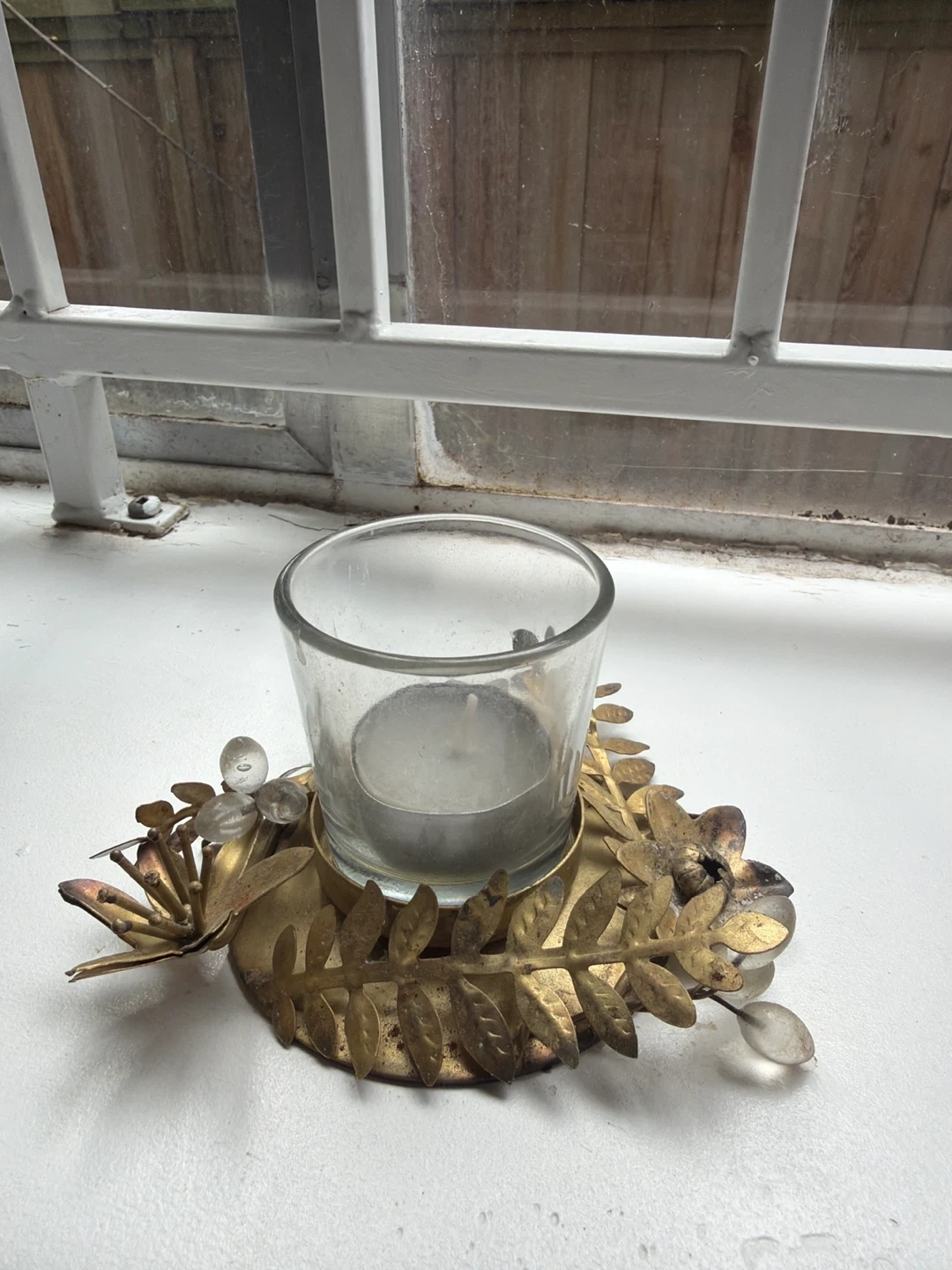 A lovely glass candle holder from the Cross with a decorative gold-toned metal base featuring leaf and floral accents. Includes a tea light candle. Adds a touch of elegance to any space!