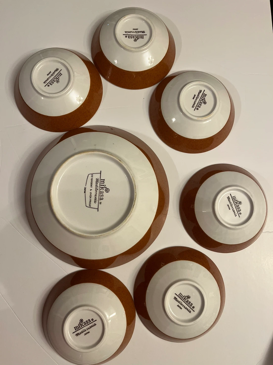 This set includes seven Mikasa Mediterrania pieces. It features a durable stoneware construction with a brown rim and white interior. Pieces are detergent and oven proof.
