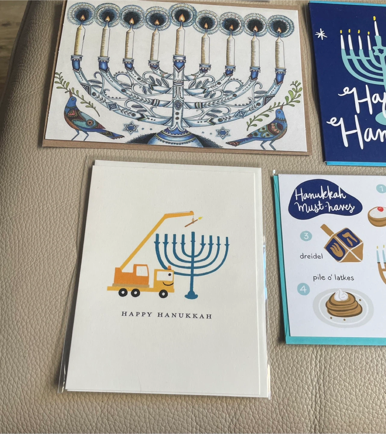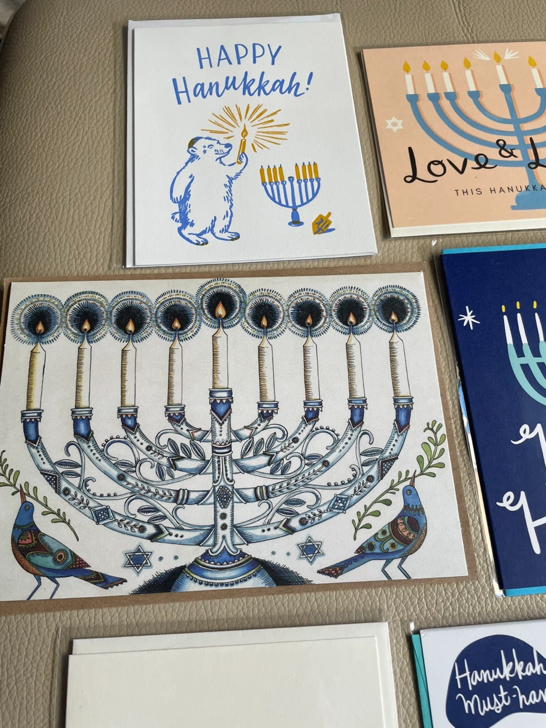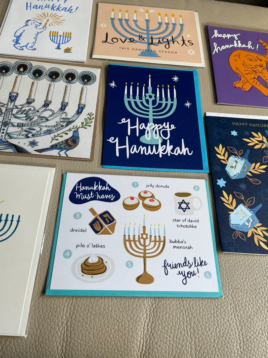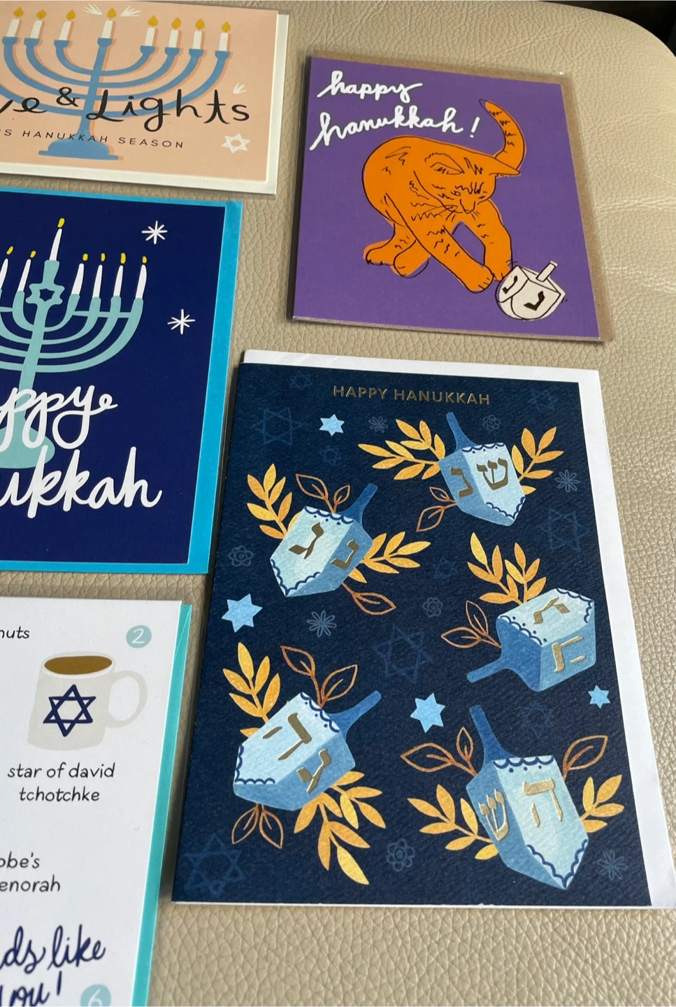 A collection of 8 festive Hanukkah greeting cards. Designs include menorahs, dreidels, and seasonal greetings. Includes cards with cute animal illustrations and food themes. Perfect for sending holiday wishes this Hanukkah season!