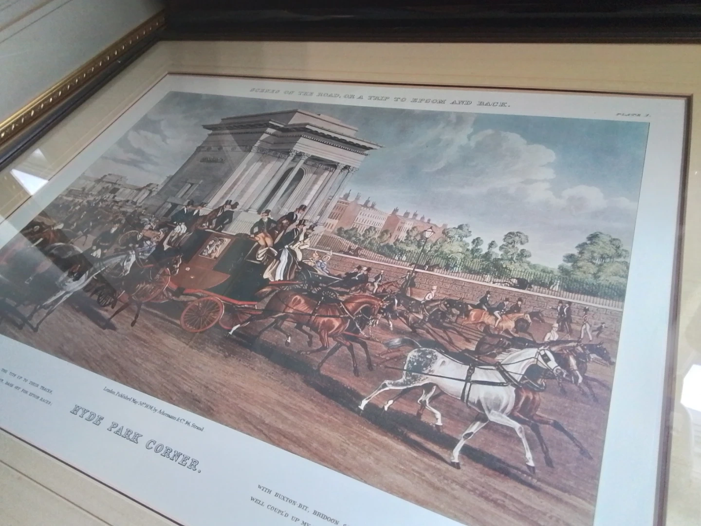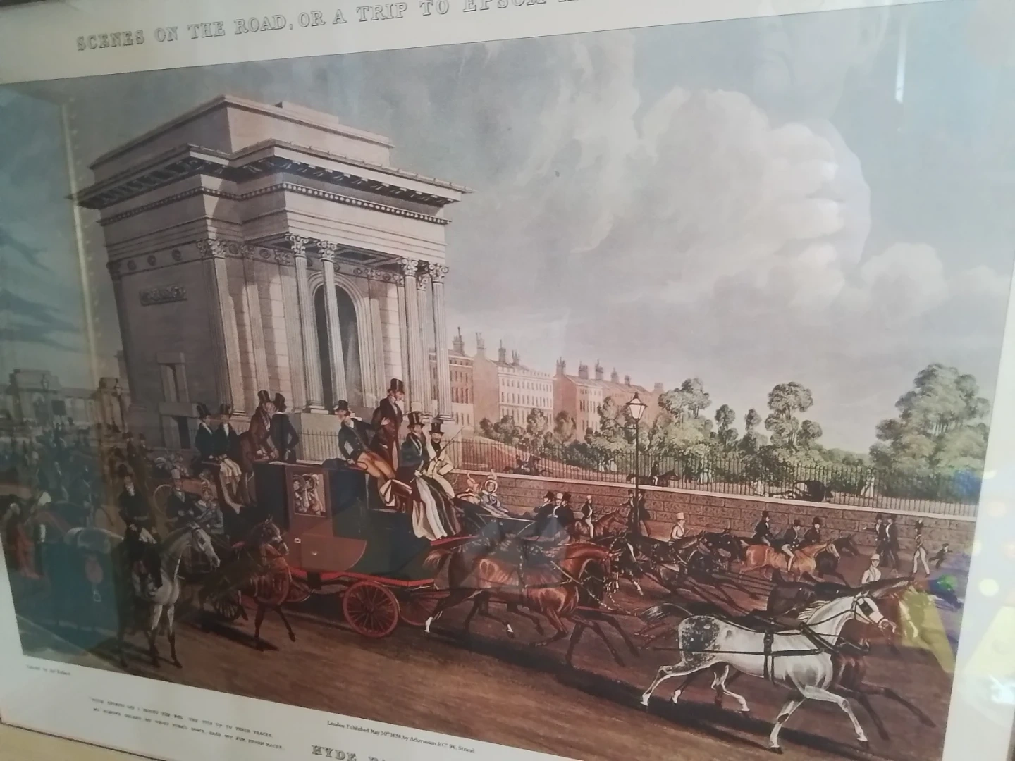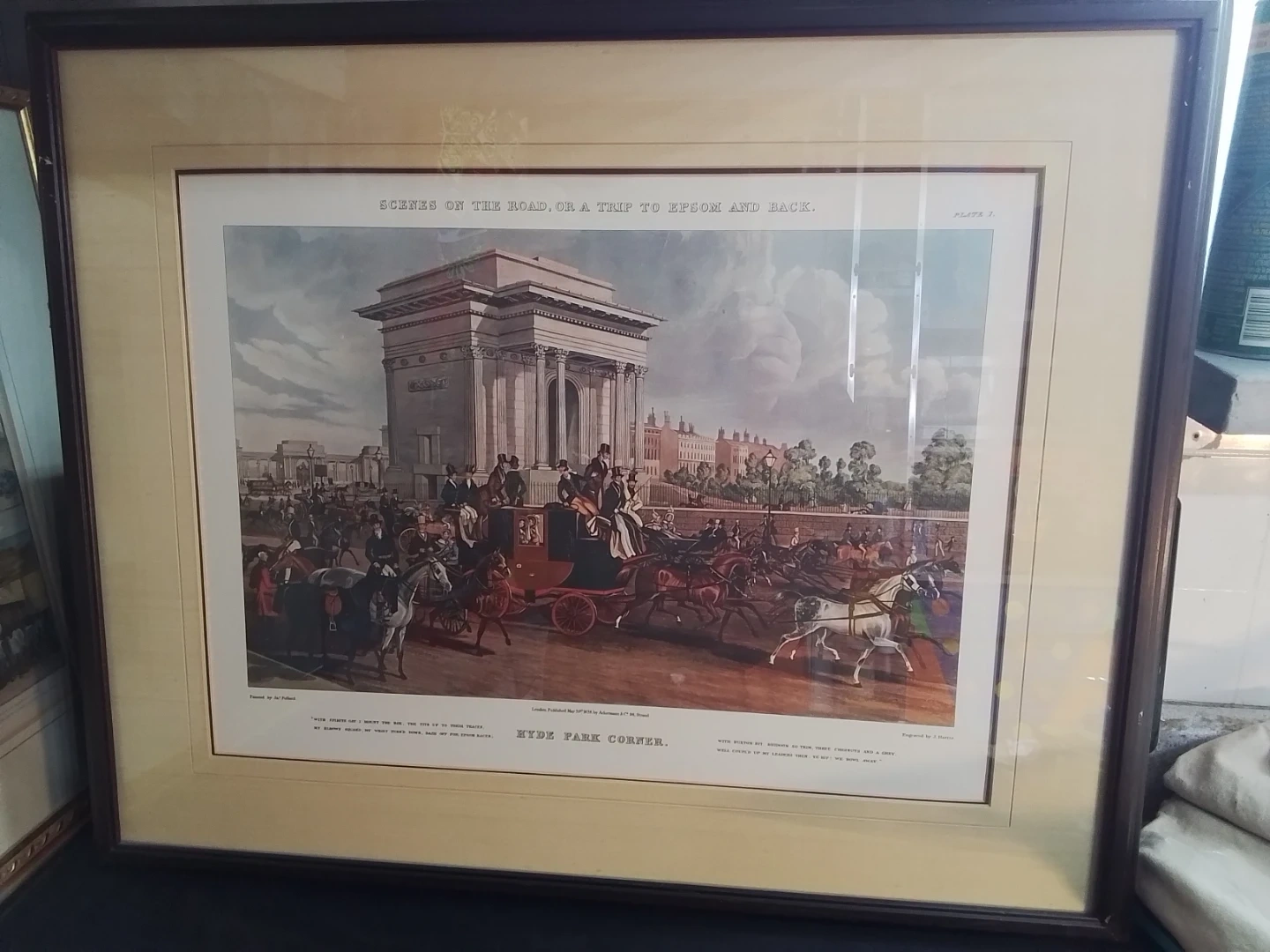 I'm offering a framed print titled 'Scenes on the Road, Or a Trip to Epsom and Back' from May 30th, 1838, published by Ackermann & Co. The print depicts 'Hyde Park Corner' and is in good condition, with dimensions of approximately 27x22 inches. Note this is a previously owned item.