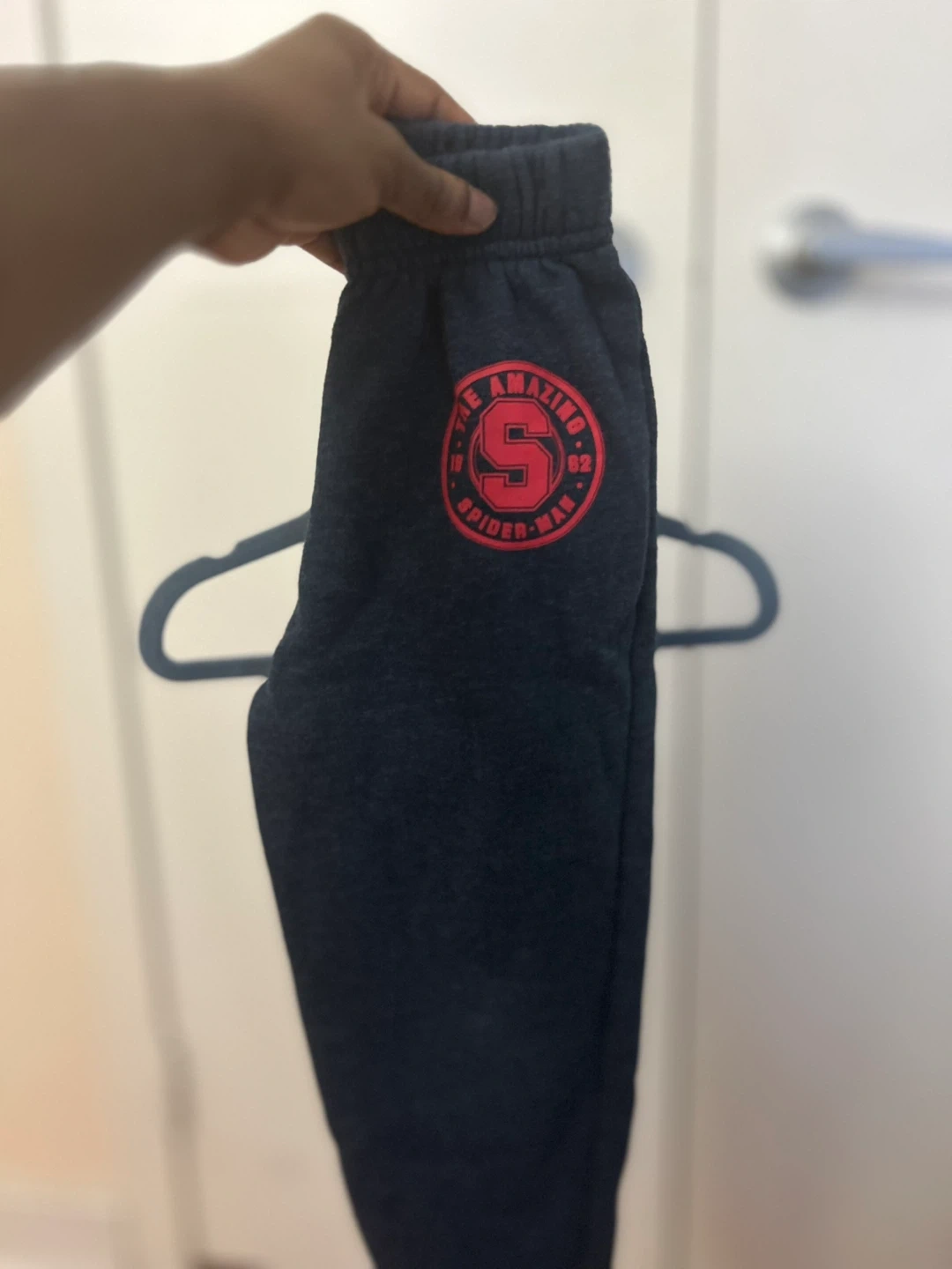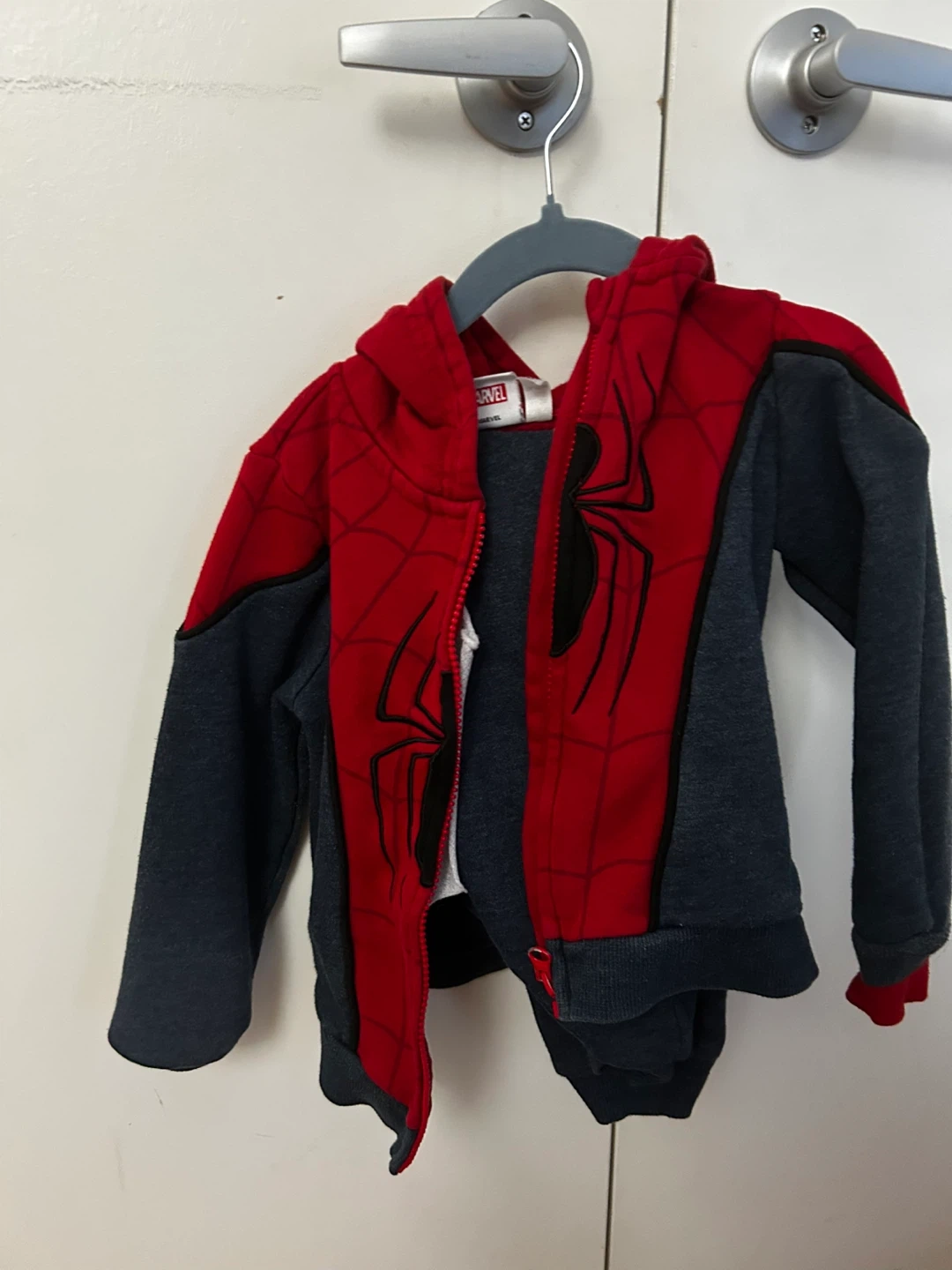 Spiderman outfit set with a hoodie and pants! The hoodie is red and black with a Spiderman design on the front, and the pants are black with a Spiderman logo on the side