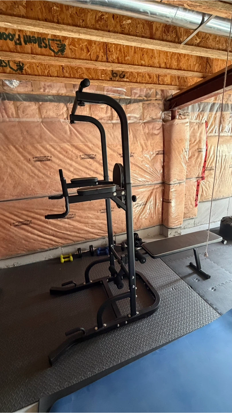 This pull-up station features a built-in bench for added versatility. It includes a padded backrest and armrests for comfort during workouts. Steel construction ensures durability.