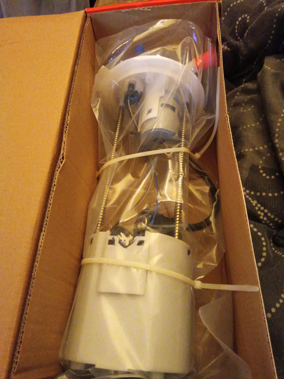 This is a new fuel pump assembly in its original box. It's a white and blue unit with silver metal rods. Includes all original packaging.