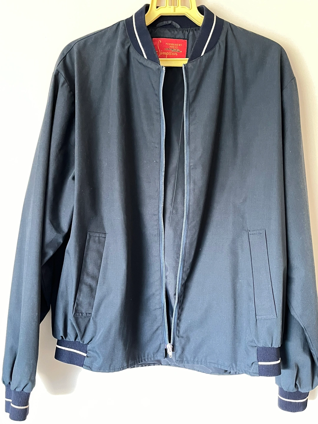 Navy blue jacket with white and navy blue ribbed trim. It's a classic bomber style with a full zip, ribbed cuffs and hem, and a comfortable fit. Two front pockets. Dark blue lining.