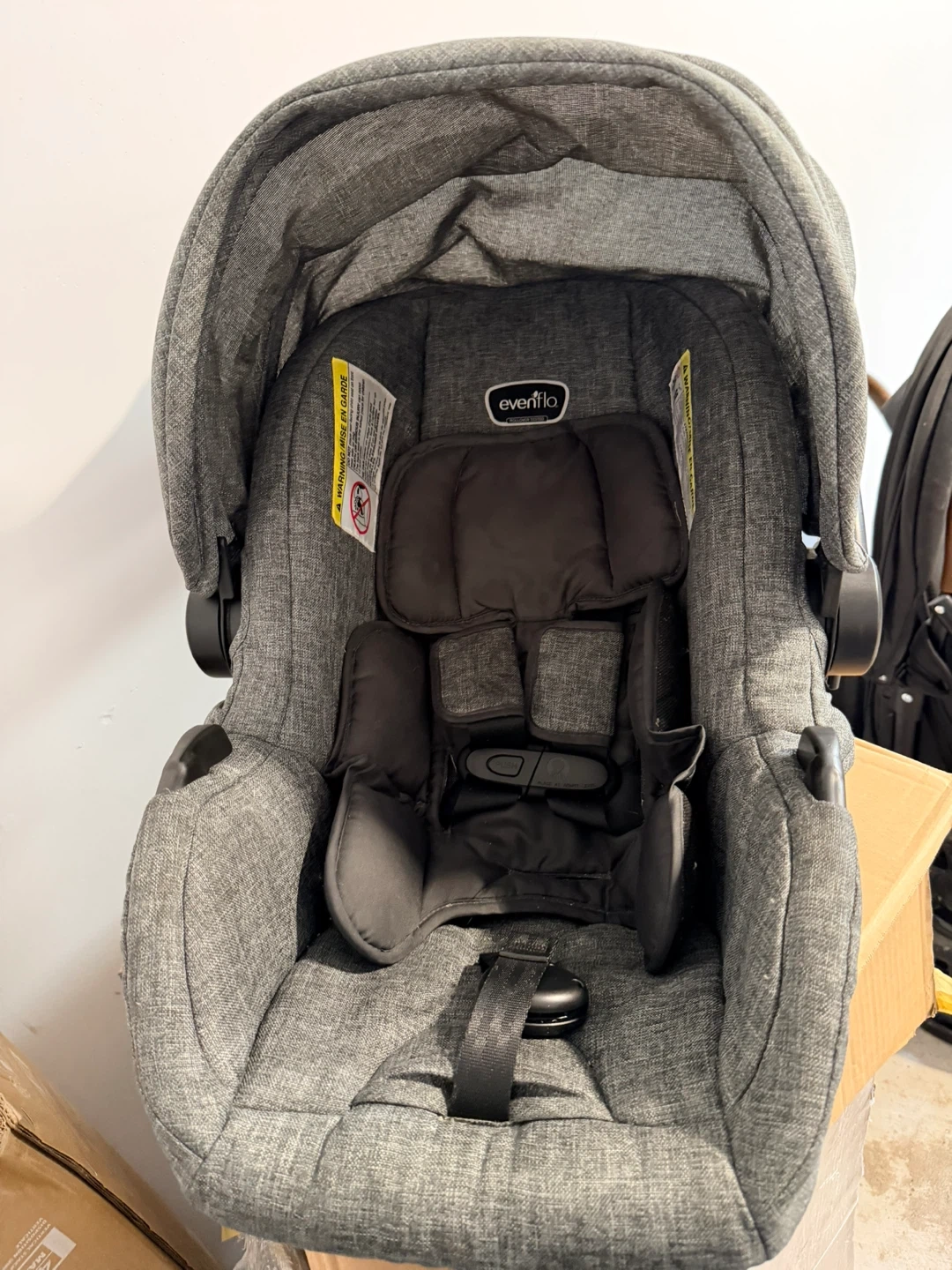 This is an Evenflo infant car seat. It's a grey heathered fabric. It has a 5-point harness system. Suitable for infants. Without base