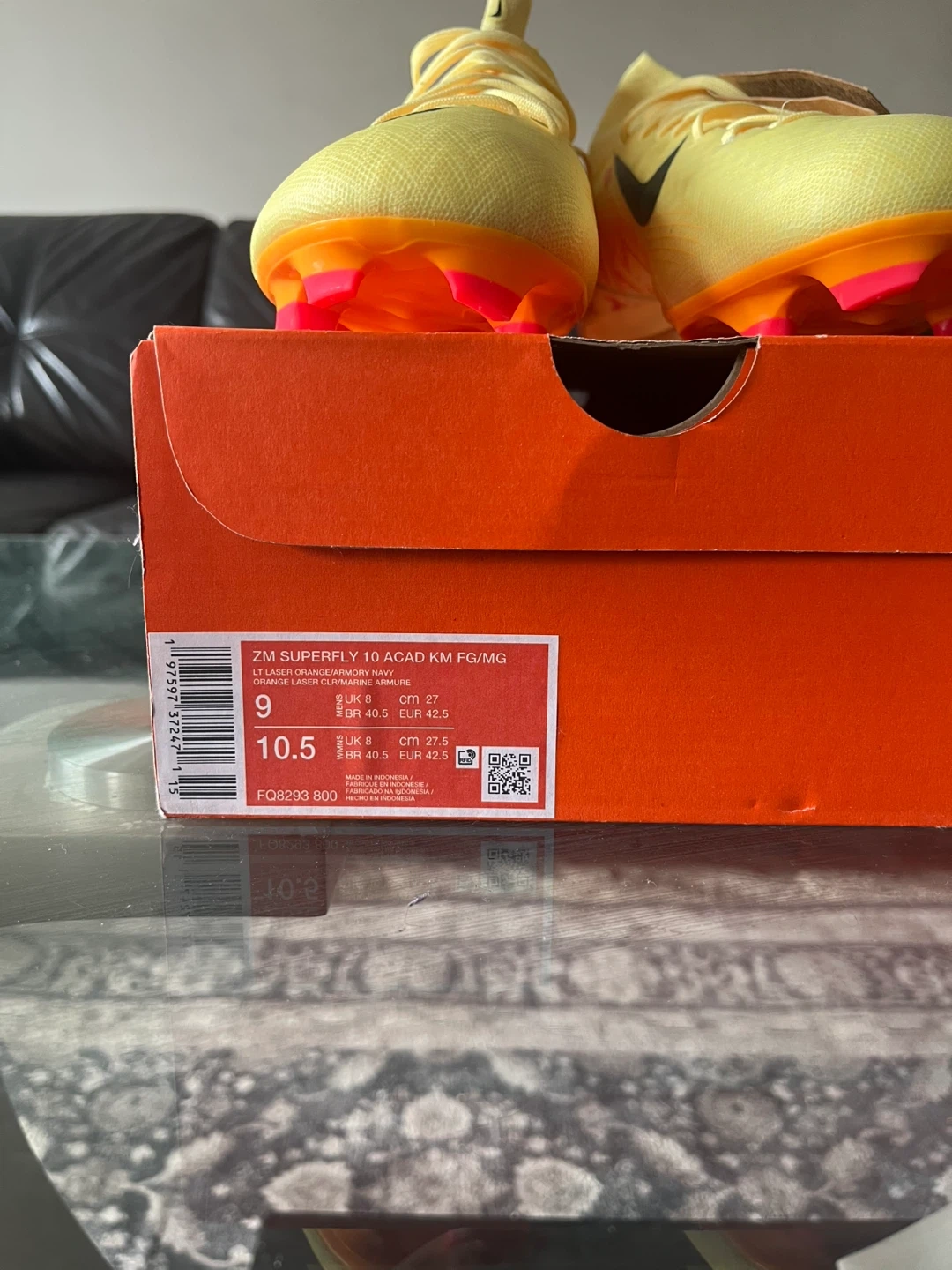 These are Nike Mercurial Superfly 10 KM FG/MG soccer cleats in a bright yellow colour. They're made with at least 20% recycled content. The size is a US Men's 9 (UK 8, EU 42.5).
