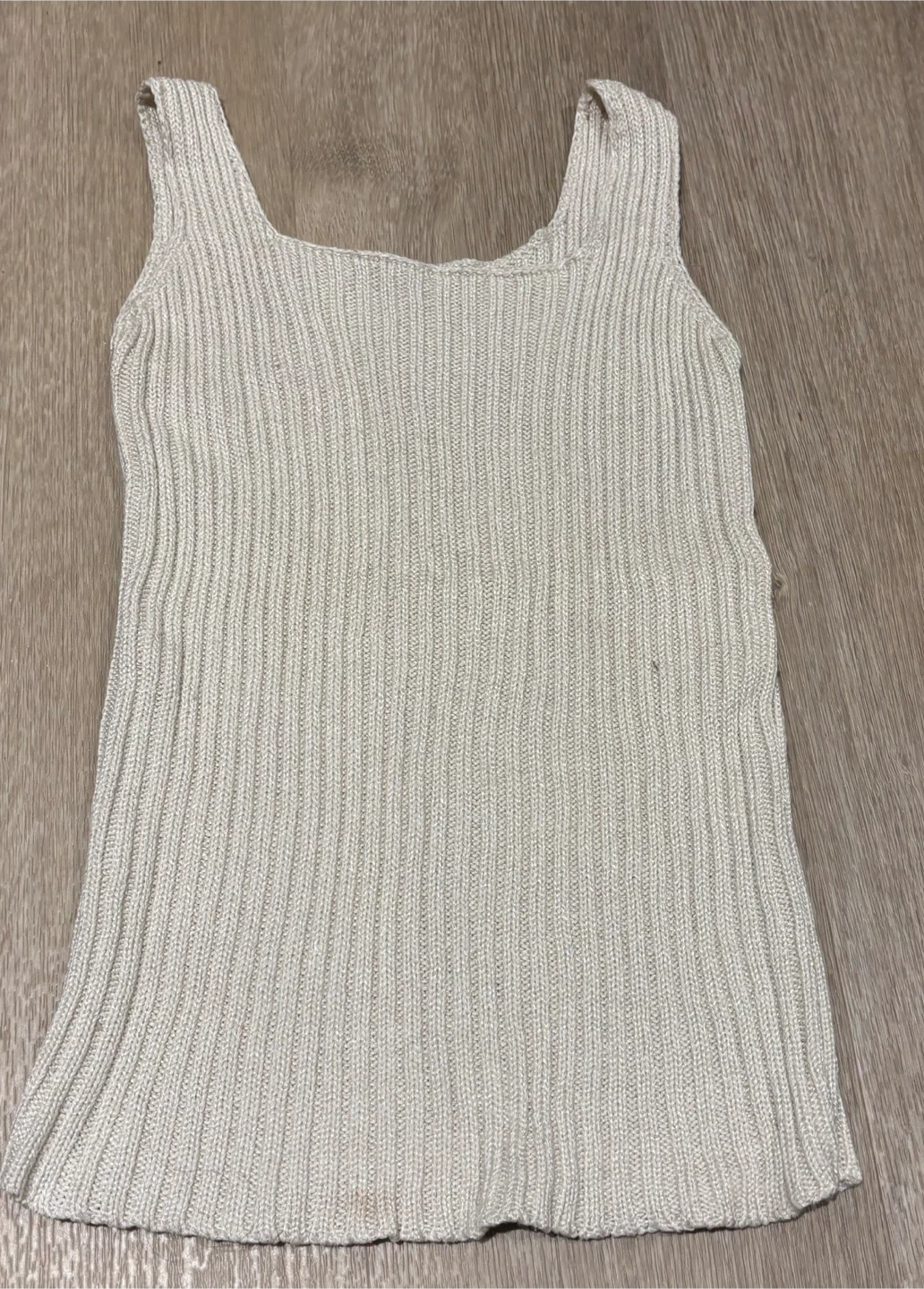 A simple ribbed knit tank top. It's a light beige colour and made of a stretchy material. Great for layering or wearing on its own!