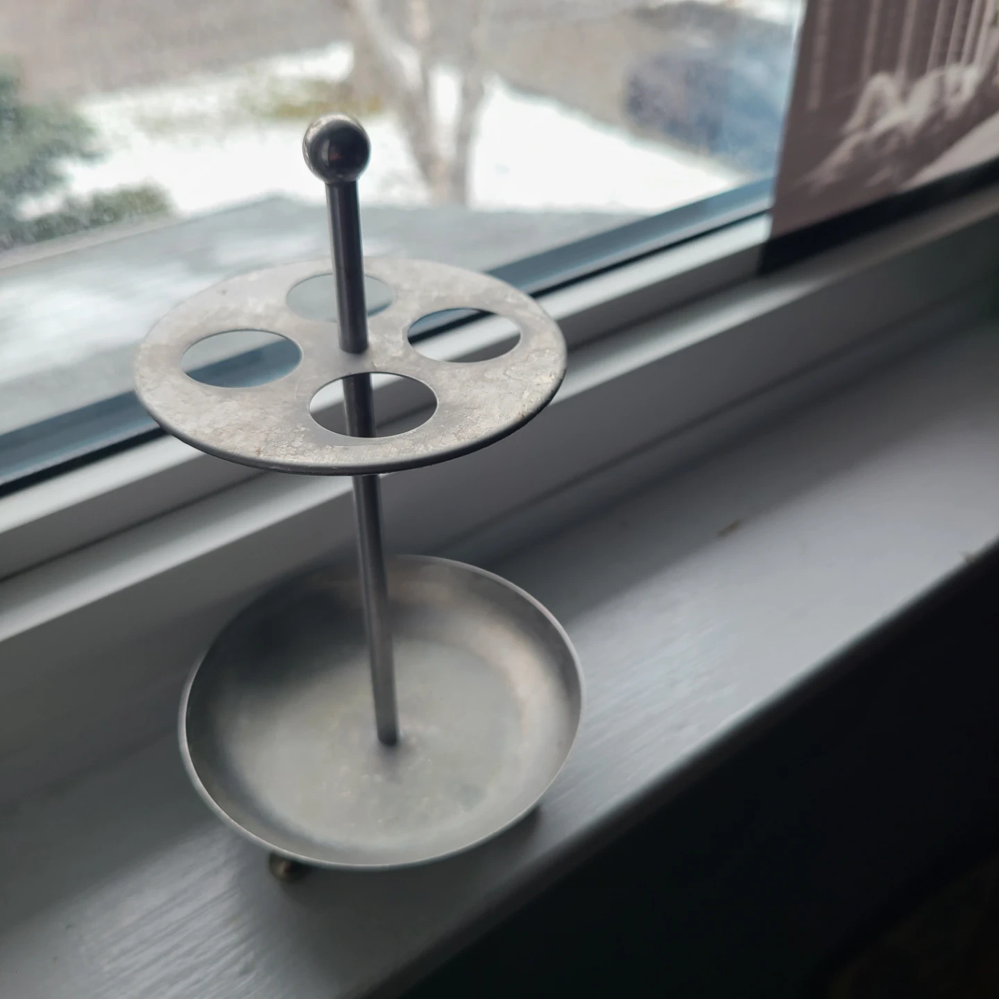 This is a metal toothbrush holder with four slots. It has a round base and a central pole with a spherical top. It's made of metal and has a brushed finish.