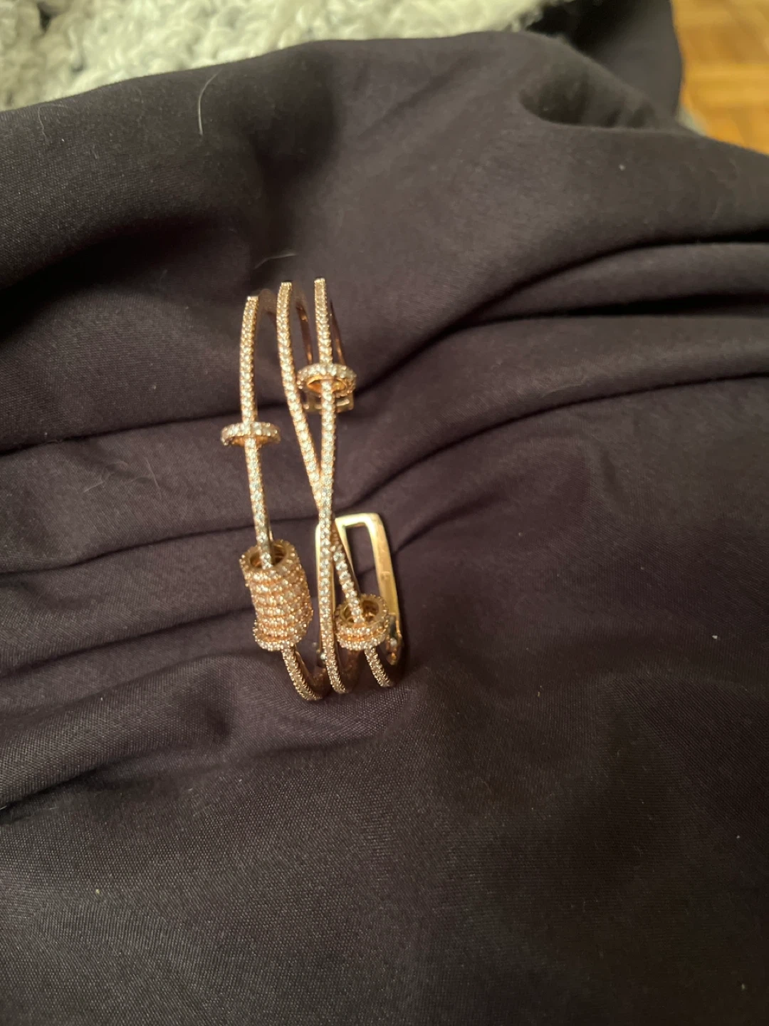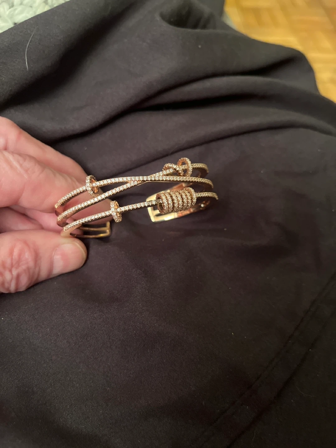 This rose gold plated 3 microns bangle is adorned with sparkling man made diamonds . It's a cuff style with an opening for easy wear. A lovely accessory for any occasion!