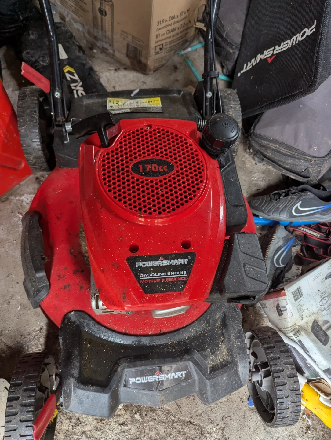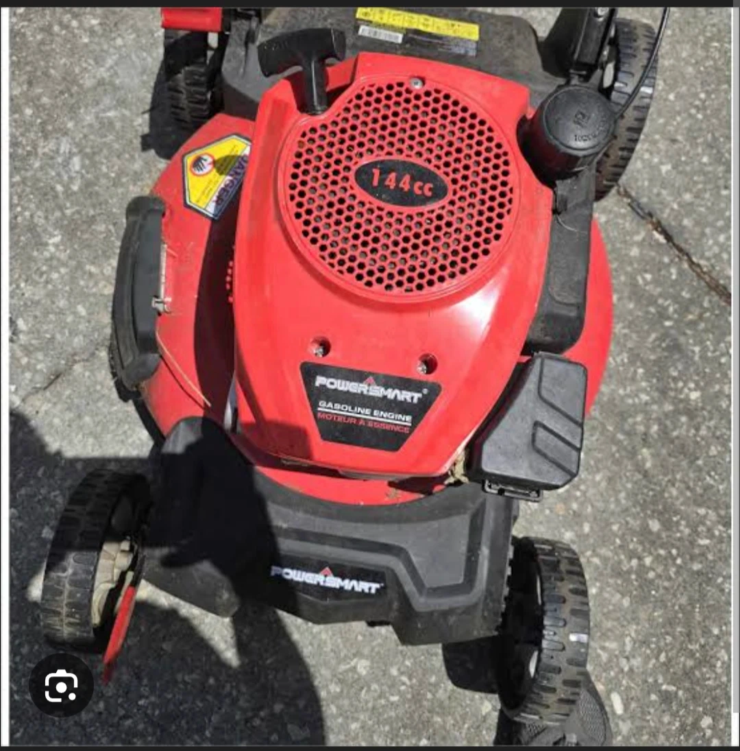 This is a PowerSmart gasoline-powered lawnmower. It features a 170cc or 144cc engine, depending on the model. It's a gas engine, ready for yard work.