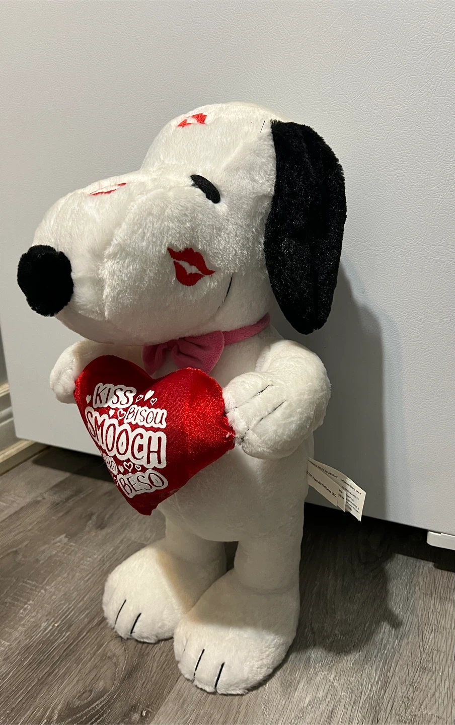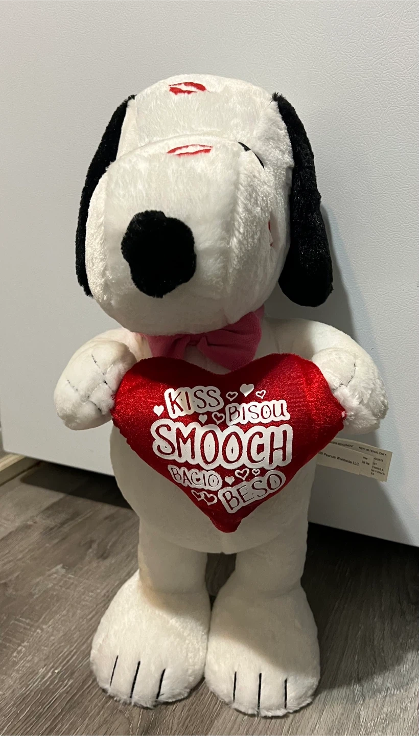 This plush features Snoopy dressed for Valentine's Day, holding a red heart with "Kiss, Bisou, Smooch, Bagio, Beso" written on it. It's soft and cuddly! Makes a sweet gift for someone special.