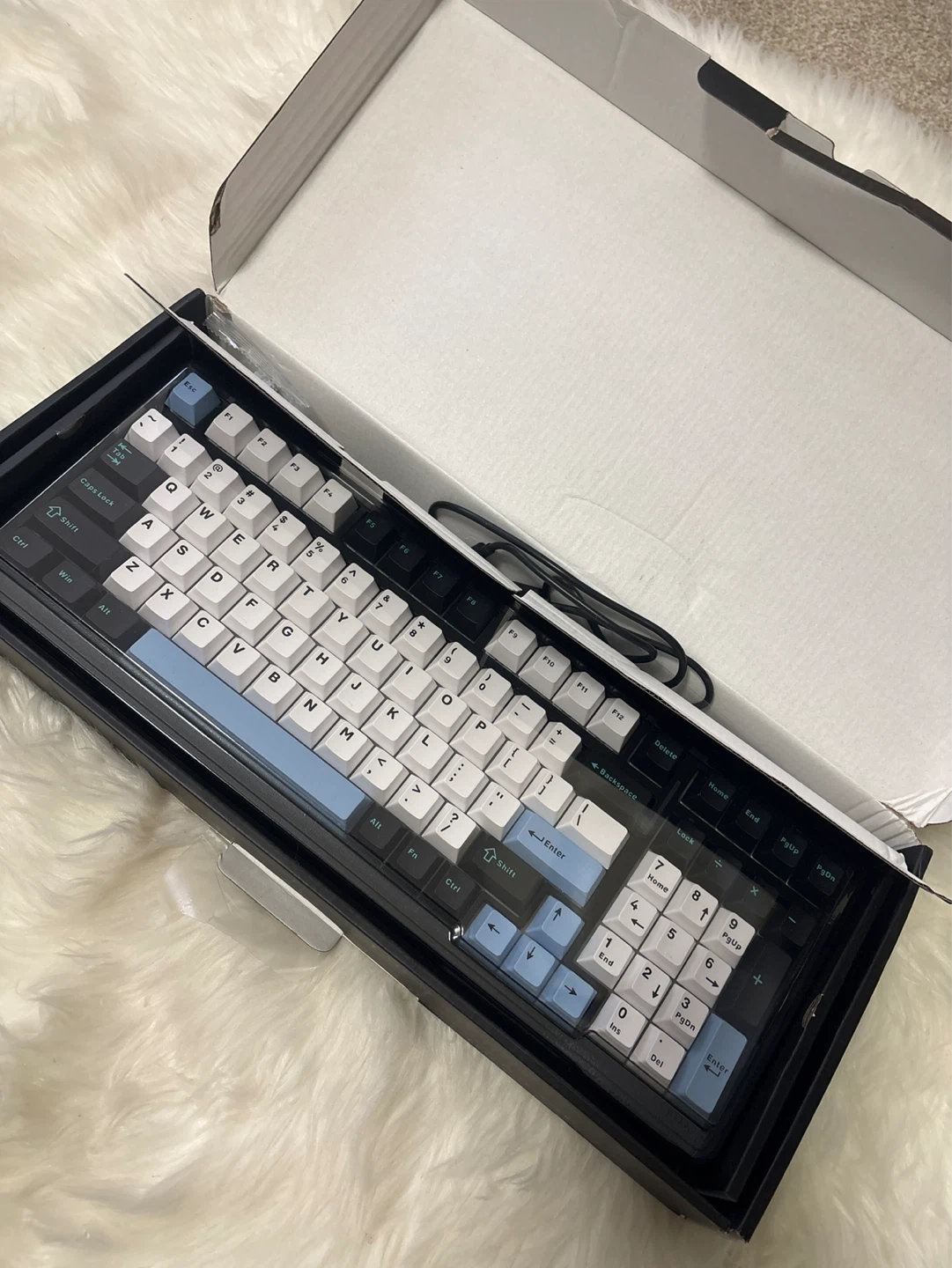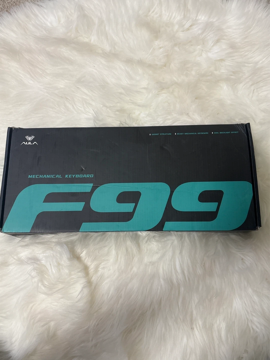 AULA F99 mechanical keyboard. It's a full-sized keyboard with a black, white, and blue colour scheme. Includes original box.