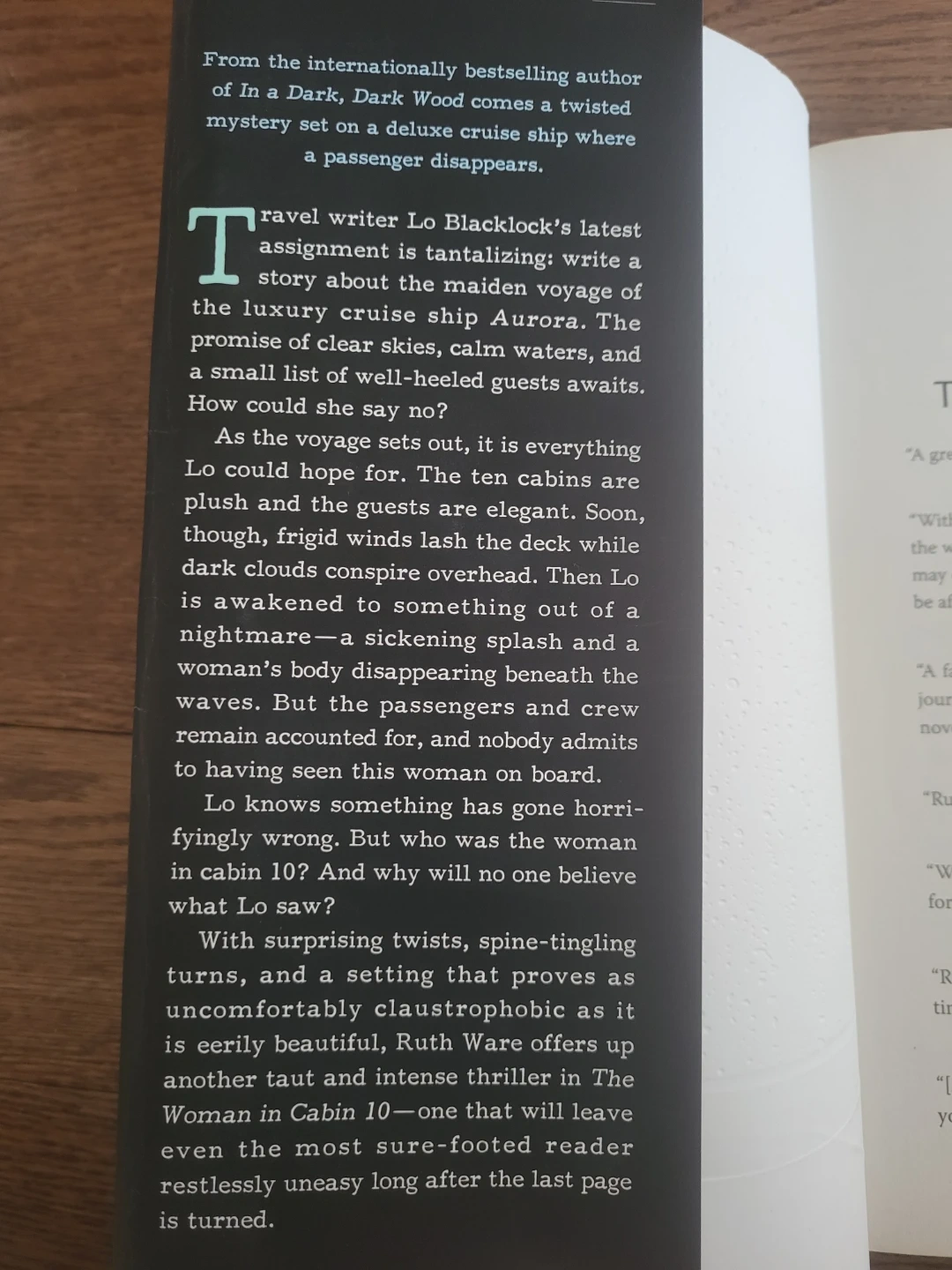 This is the paperback novel "The Woman in Cabin 10" by Ruth Ware. It's a mystery thriller novel about a journalist on a luxury cruise. Good condition!