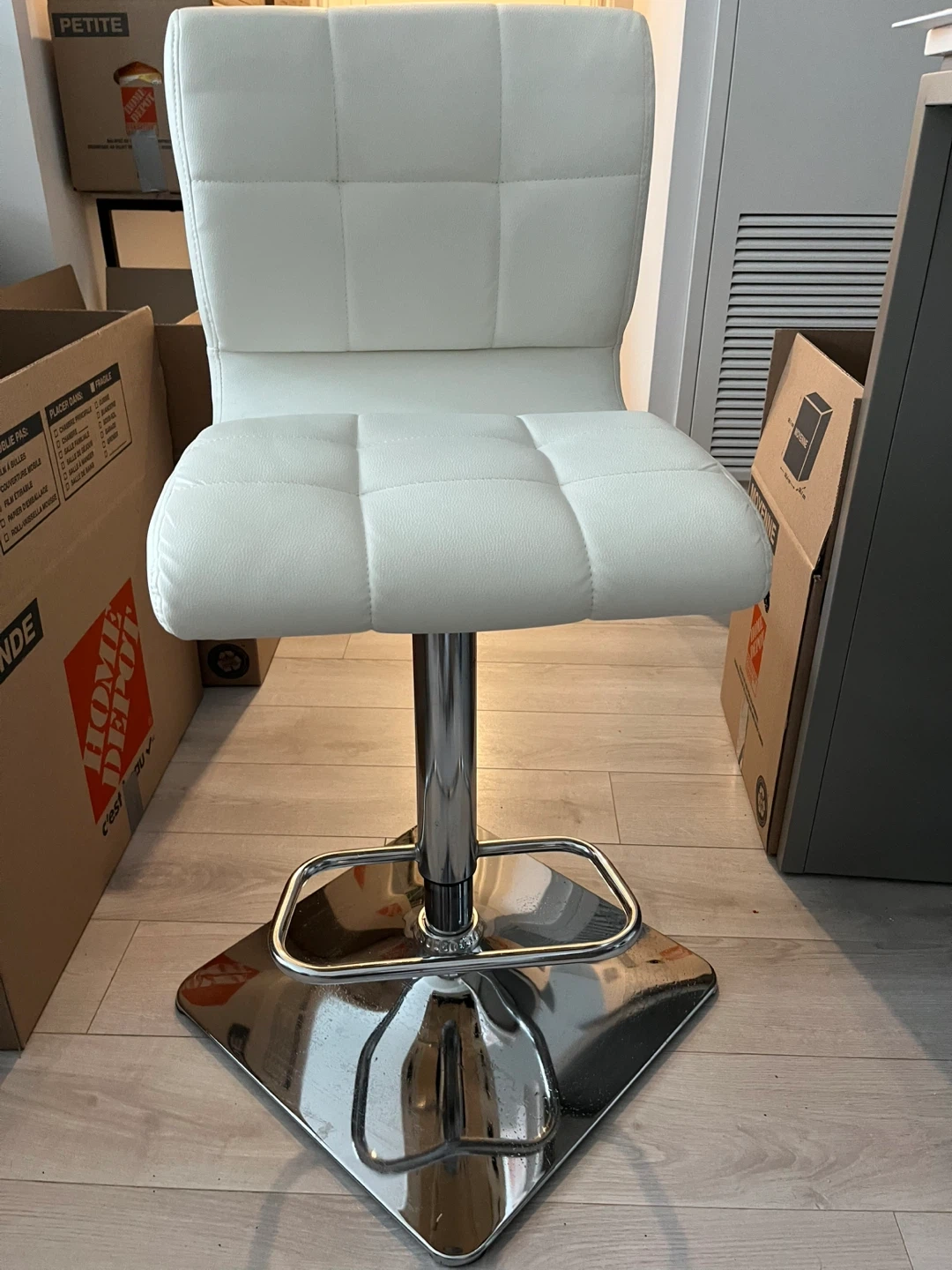 Two white faux leather bar stools with square chrome bases. They’re adjustable in height!