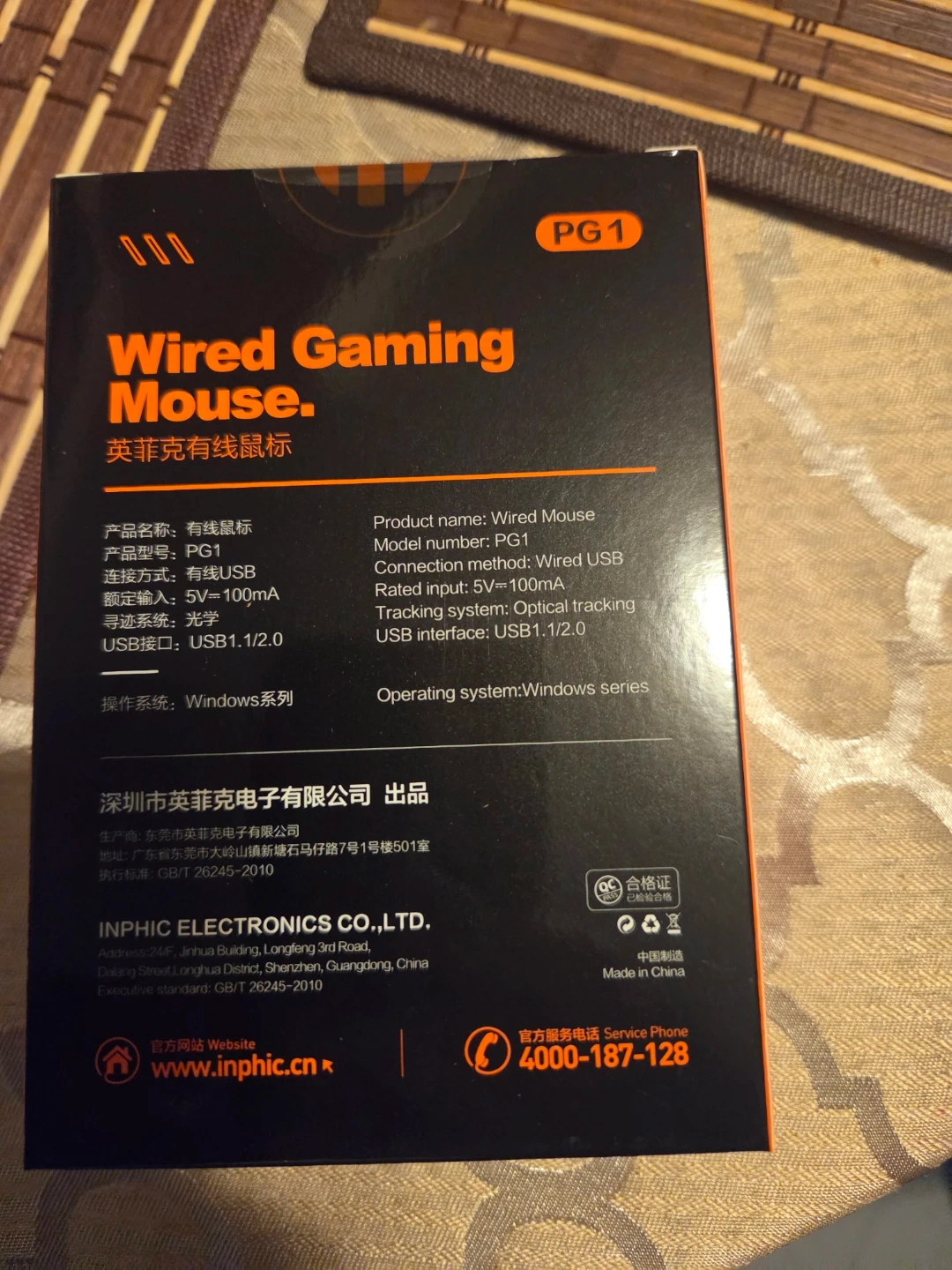 This is an Inphic PG1 wired gaming mouse. It's designed for PC gaming and connects via USB. The mouse features optical tracking and is compatible with Windows operating systems.