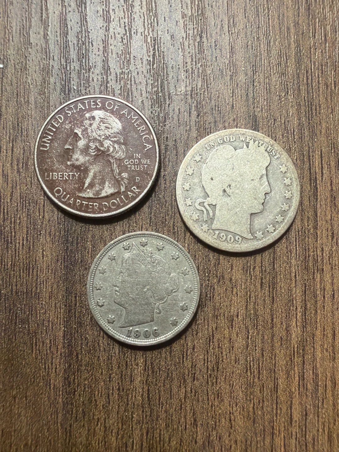 This lot includes three United States coins: a 1909 Barber Quarter Dollar, grade AG3 a 2002 D Samoa Quarter, grade MS 62 and a 1906 Liberty V Nickel Grade F12. All coins are circulated.