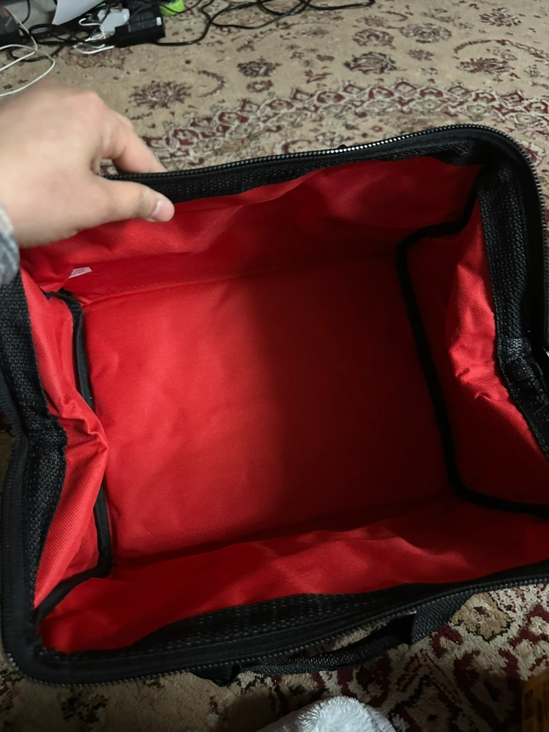 Red and black canvas tool bag with embroidered Milwaukee logo. Features exterior pockets and a zippered closure. Perfect for storing small tools or accessories.