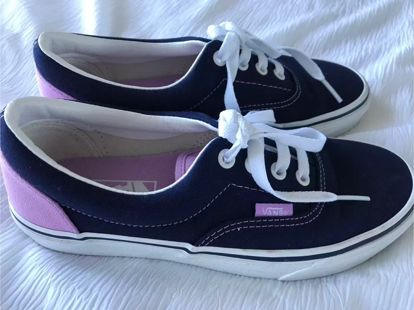 These Vans low top sneakers are a classic choice. They feature a navy canvas upper with pink accents on the heel and interior. Lace-up closure for a secure fit.