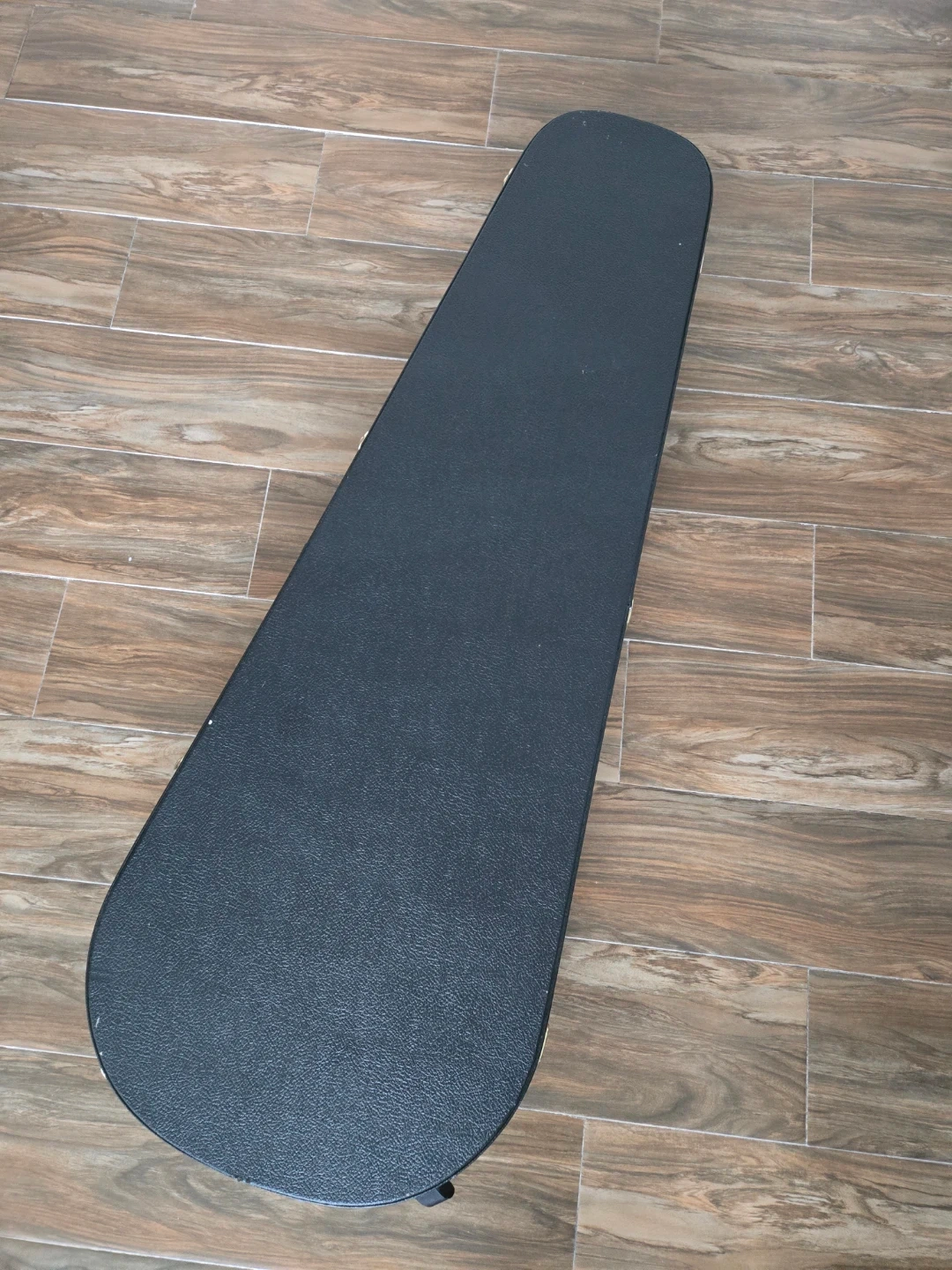 This is a black hardshell case for a guitar. It's lined with plush black fabric and features sturdy latches. Great for protecting your instrument during transport!