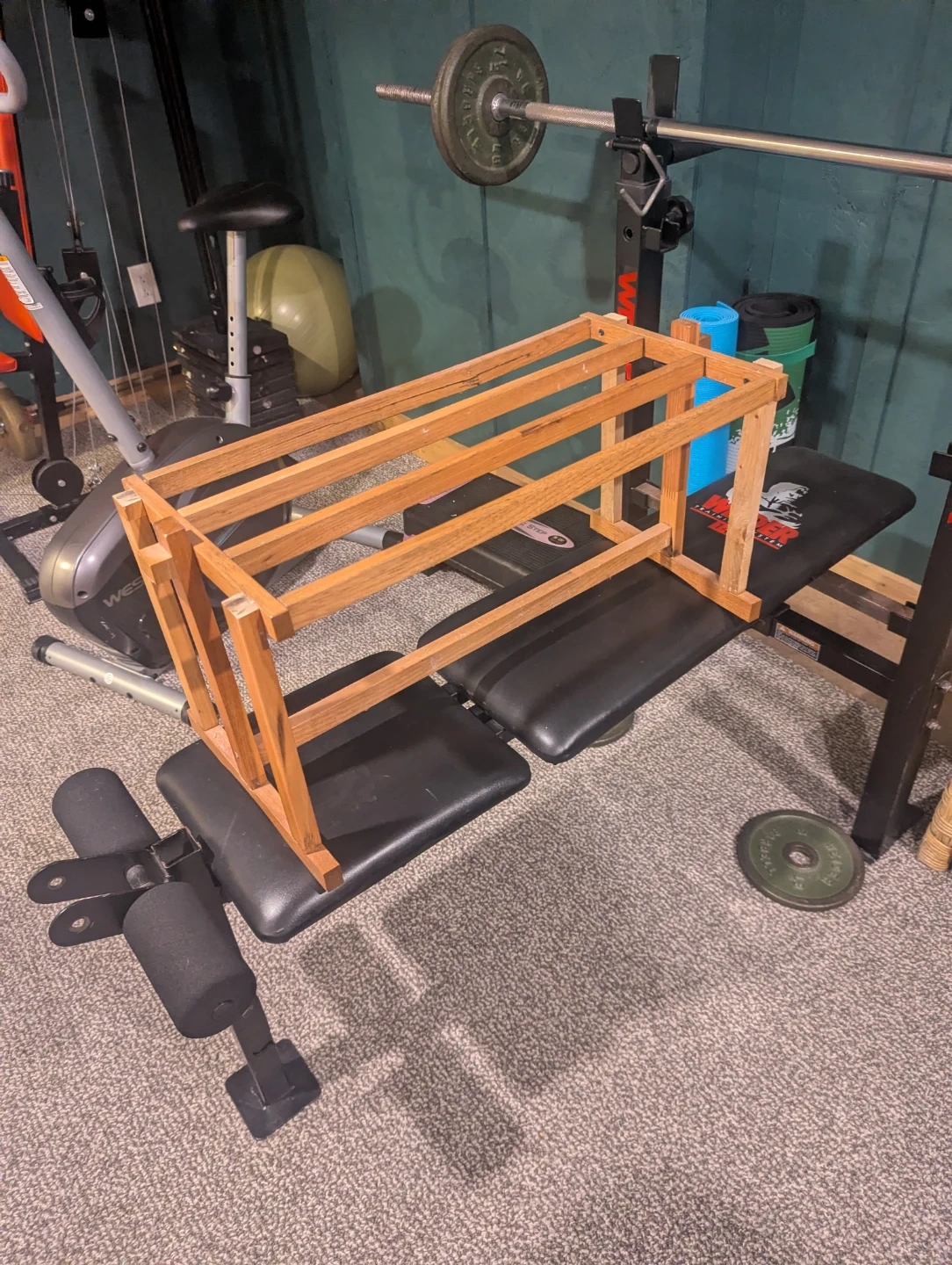 A simple, unfinished wooden plant stand. It's made of solid wood and has two tiers. This rack would be great also, for the shower.