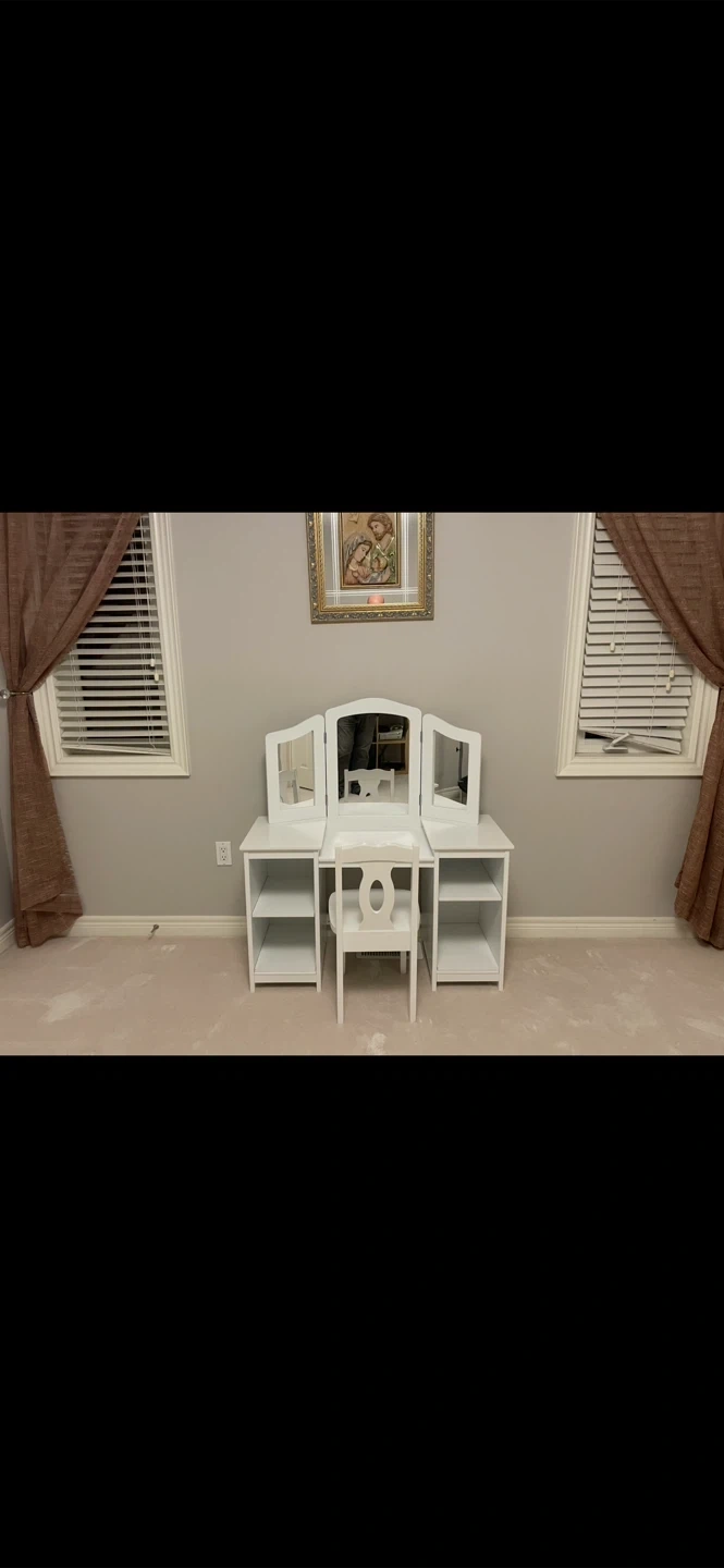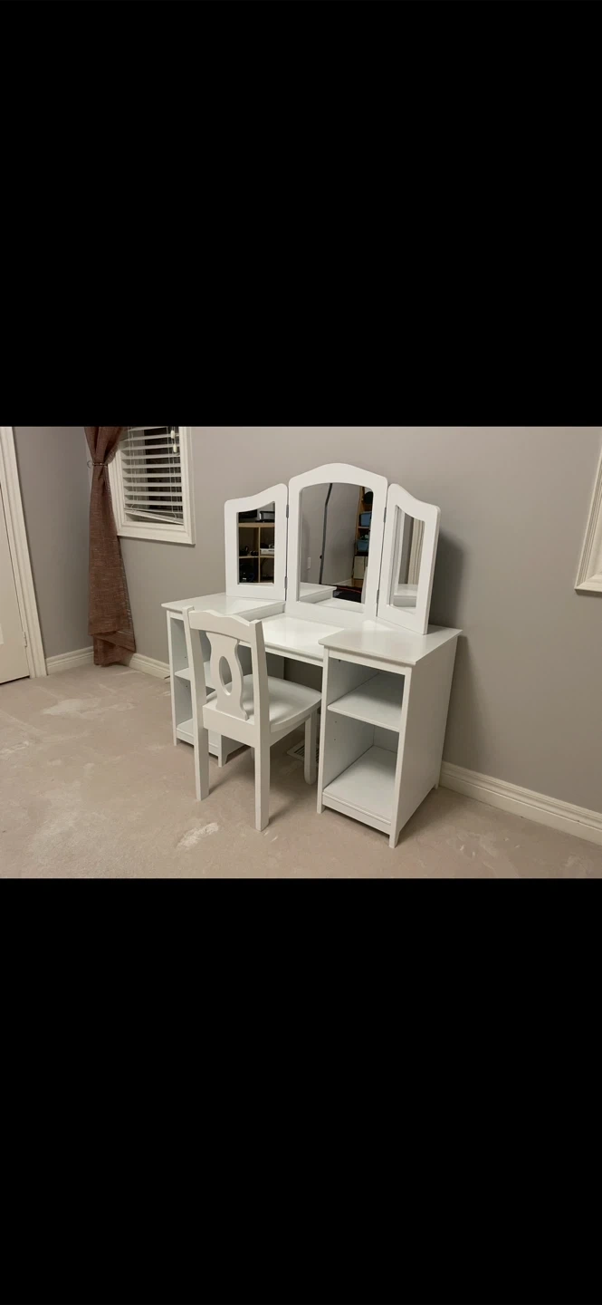 This white vanity set includes a table with a triple mirror and a matching chair. It has open shelving on both sides for storage. It's perfect for a child's bedroom or play area.