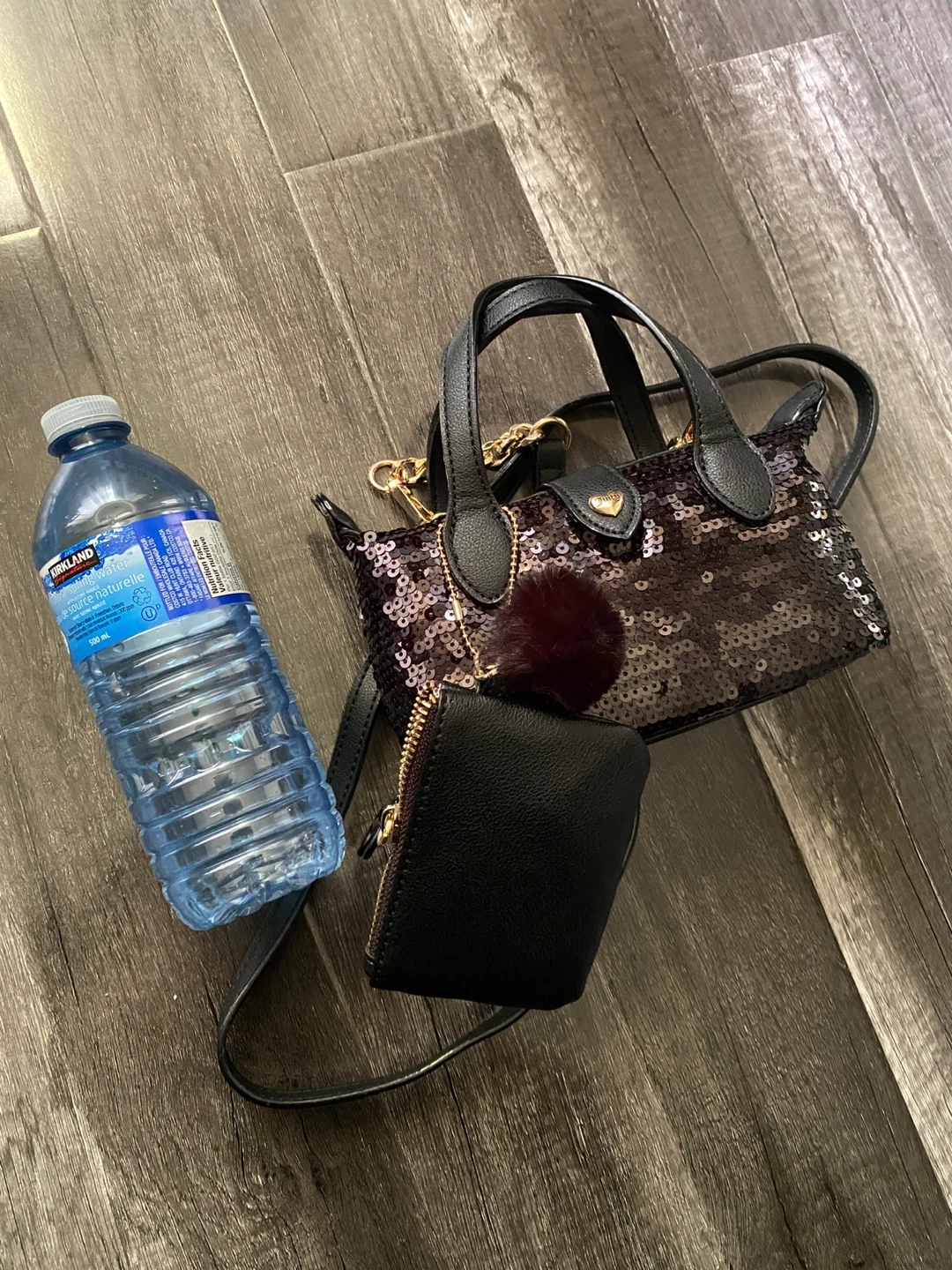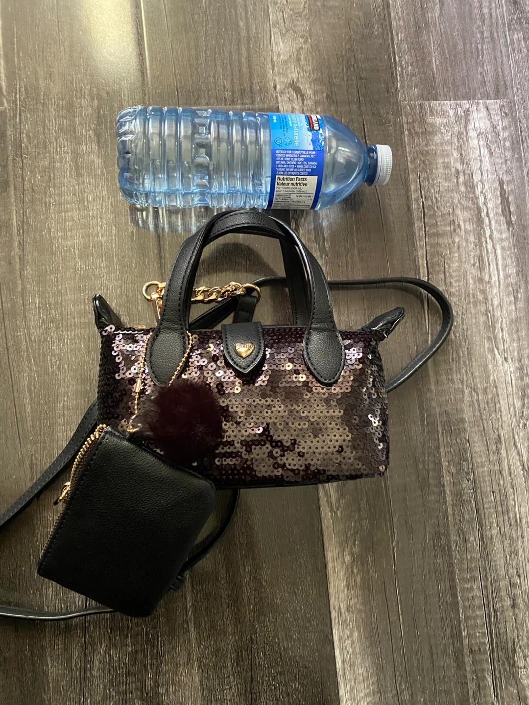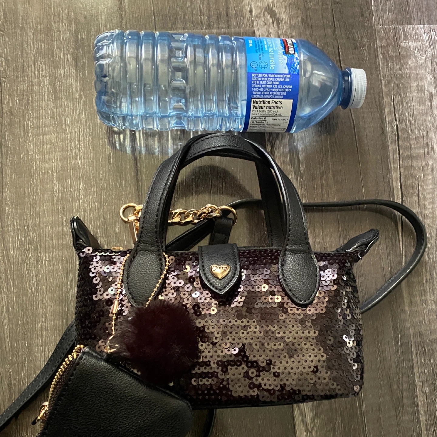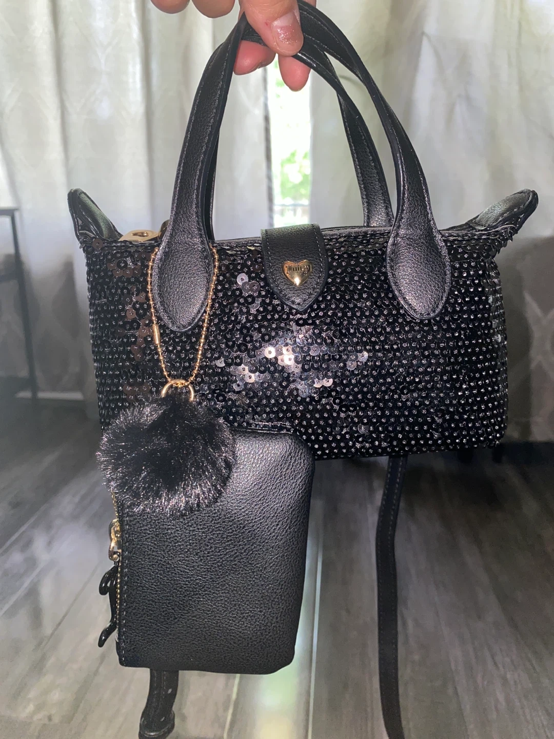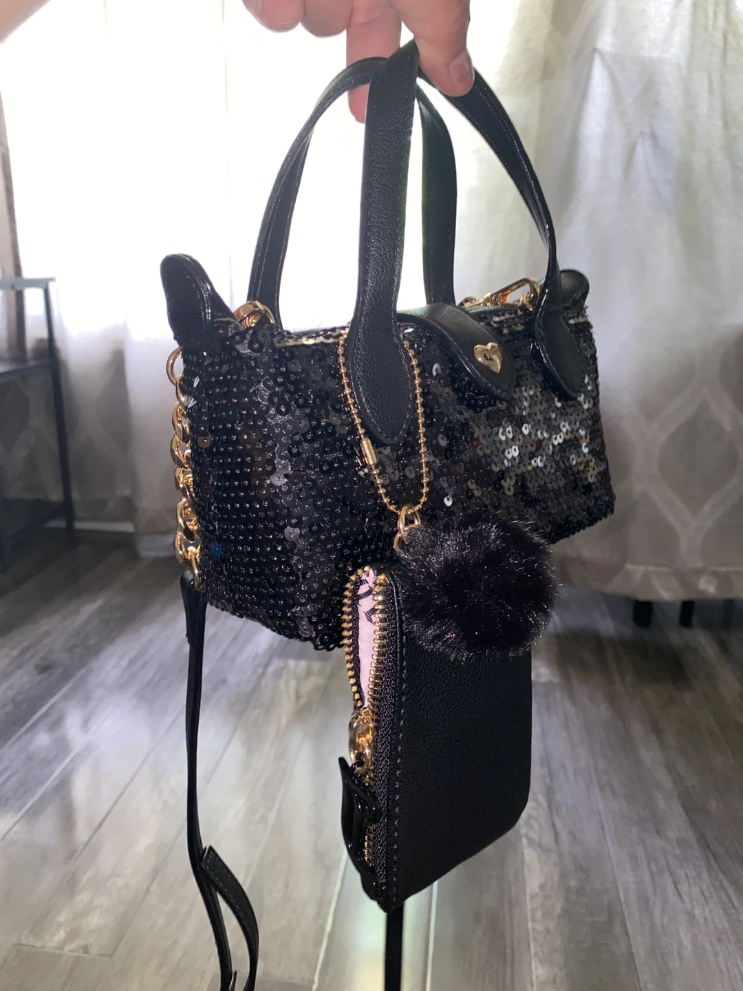 This cute Juicy Couture mini bag features black sequins and comes with a small, detachable pouch! It's perfect for a night out or when you want to carry just the essentials
