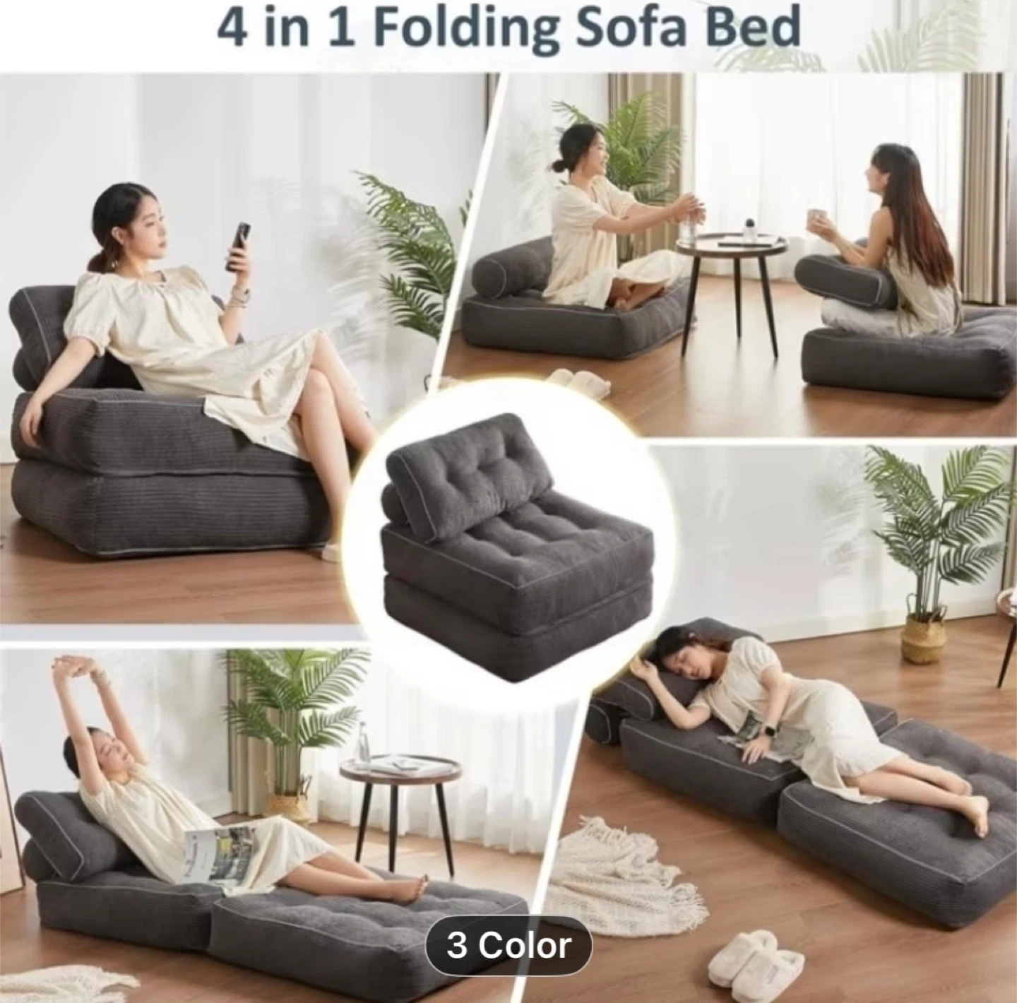 This is a 4-in-1 folding sofa bed that can be used as an ottoman or footrest. It's upholstered in grey corduroy fabric. Product dimensions are 33.5" L x 33.5" W x 15.7" H when folded as an ottoman. When unfolded as a bed, it measures 74.8" L.