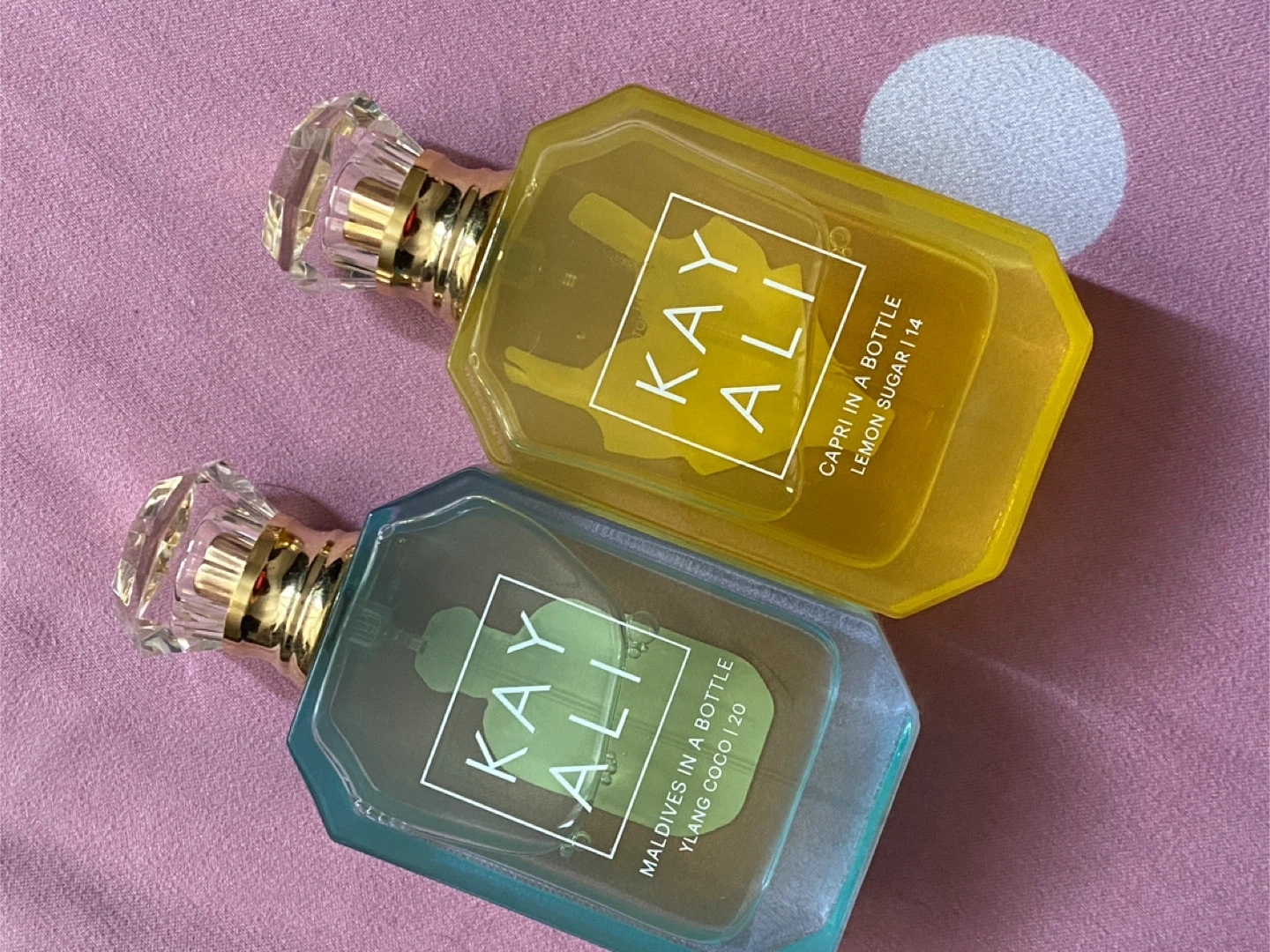 Two Kayali fragrances: Capri in a Bottle (Lemon Sugar) and Maldives in a Bottle (Ylang Coco). Each bottle features a distinct scent and colour. Perfect for trying new scents!