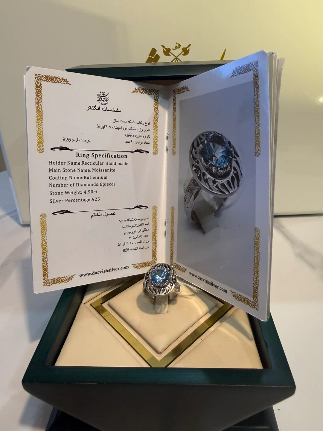 Selling a brand new Darvish Silver ring. It's a size 925. The main stone is Moissanite and the coating name is Ruthenium. The ring has 6 pieces of diamonds and the stone weight is 4.90ct.