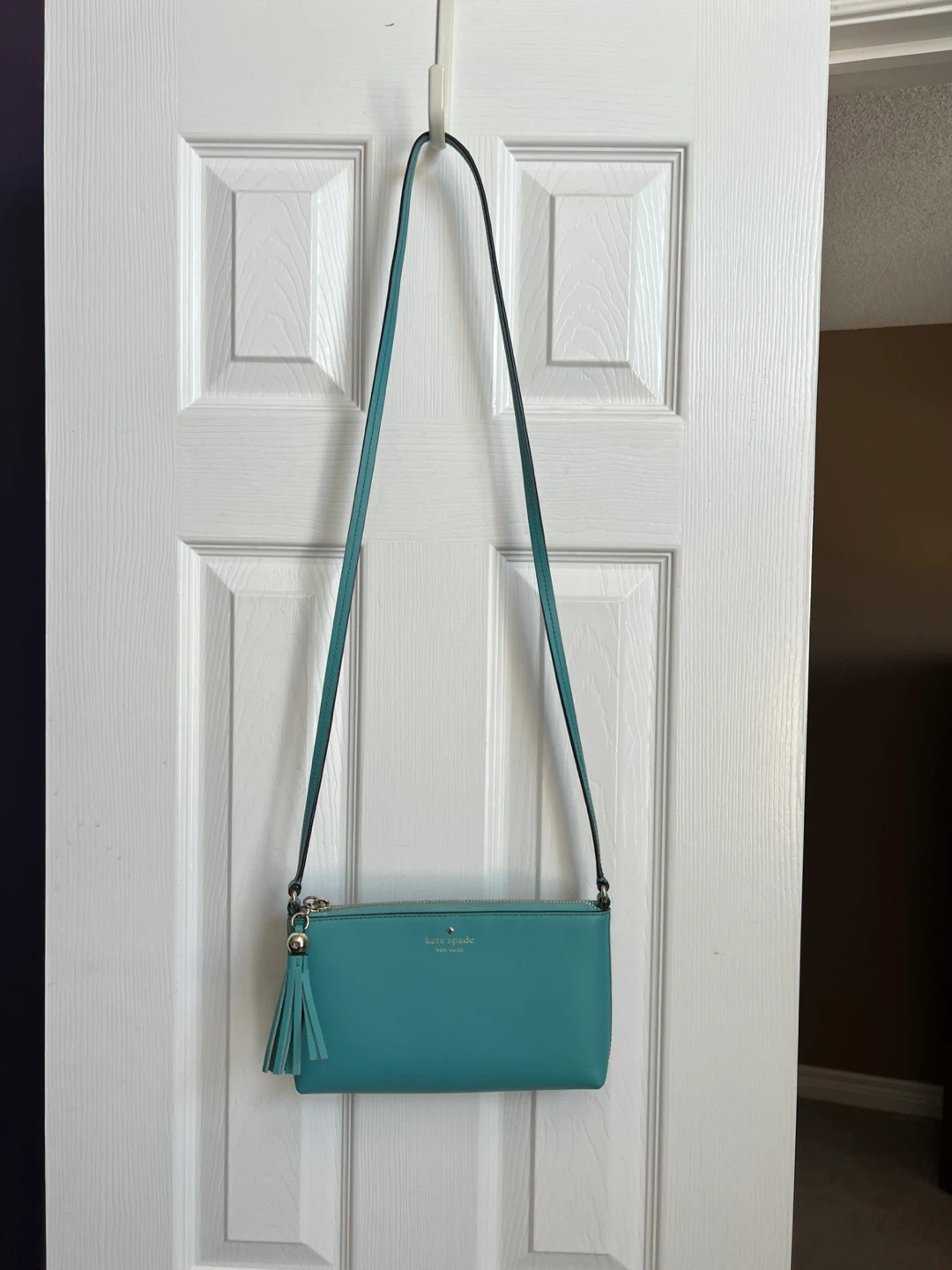 Kate Spade crossbody bag in a vibrant turquoise colour. It's made of leather and features a cute tassel detail on the zipper. Perfect for carrying essentials when you're on the go!
