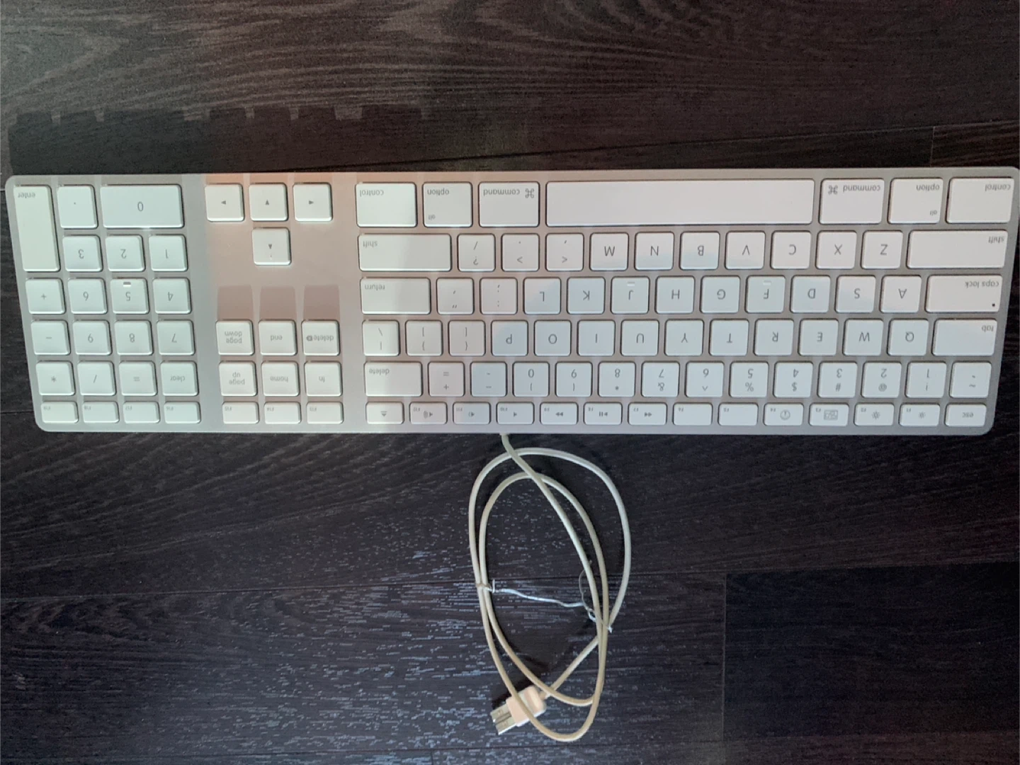 Selling an Apple wired keyboard with a numeric keypad in silver colour. It's in great condition.