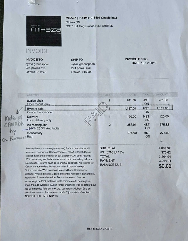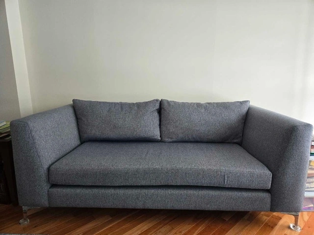 This elegant Mikaza sofa offers both style and comfort for your living space. It has been gently enjoyed for 6 years and remains in excellent condition, ready to enhance your home decor. Model: G Romano, Canadian made. Colour: Gray Blue. Dimensions: 78 inches wide, 38 inches deep, 30 inches high. Seat depth is 21 inches. Cash accepted.