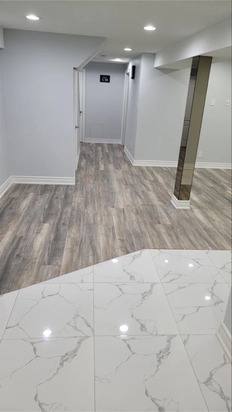 Beautifully renovated basement featuring modern laminate flooring and sleek marble-look tiles. Includes a functional kitchen with light grey cabinetry and a stainless steel fridge, plus a stylish 3-piece bathroom with a glass-enclosed shower. This space is perfect for a rental unit or in-law suite!msg for more info